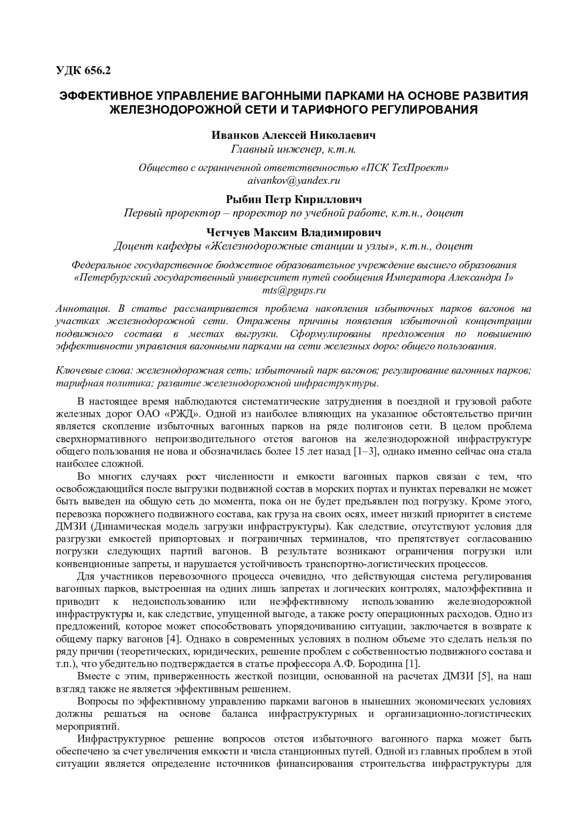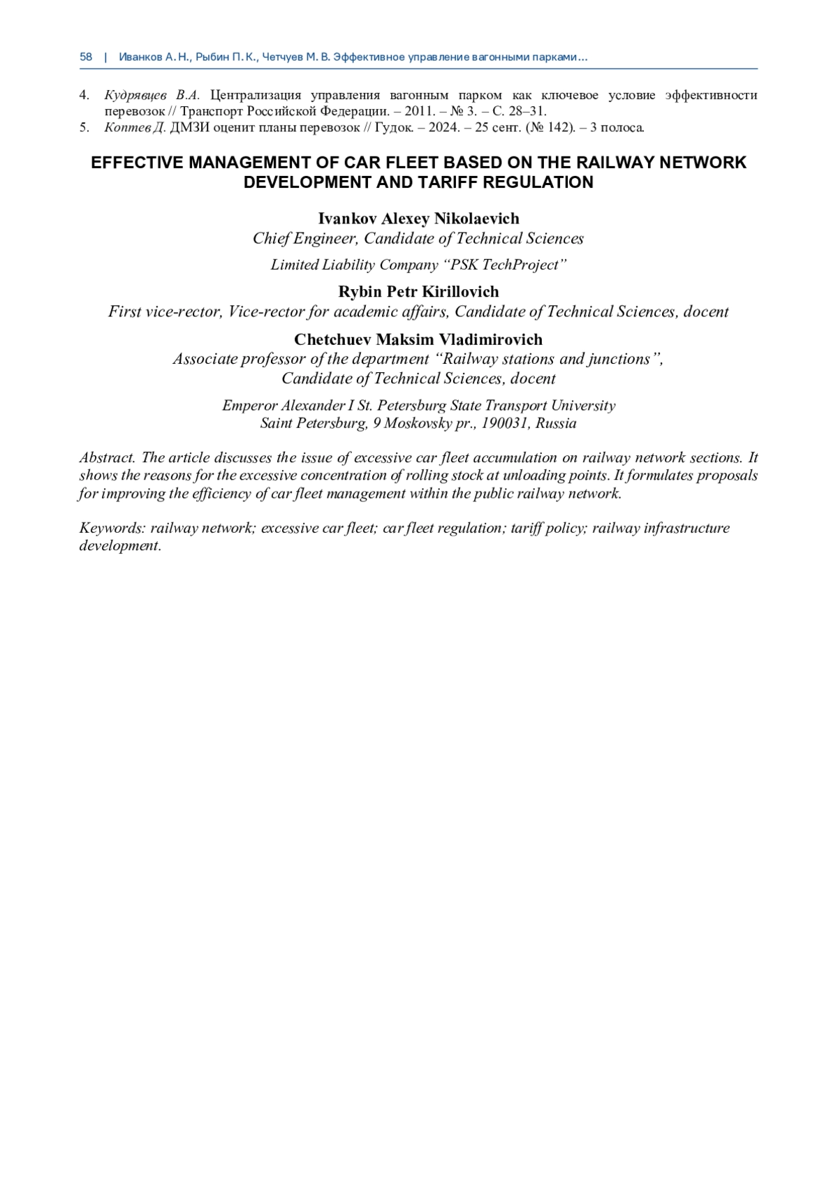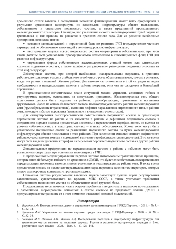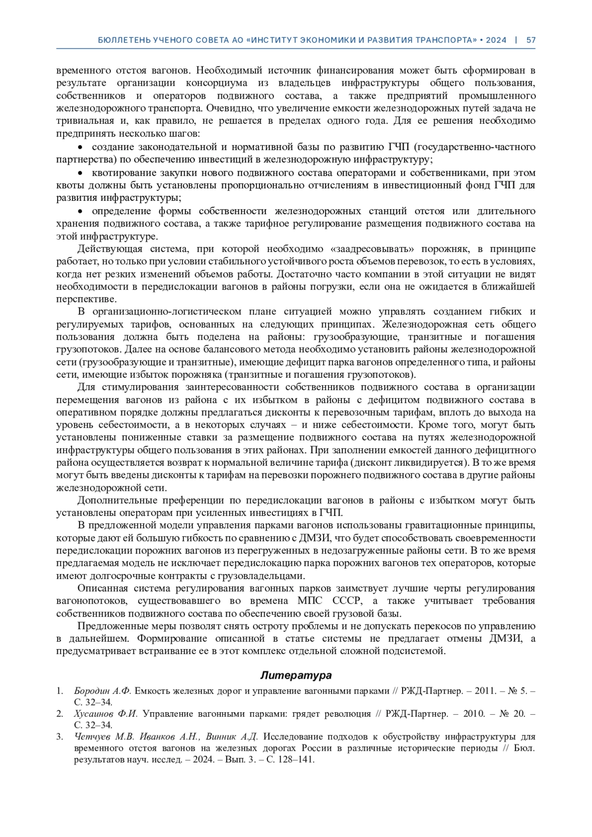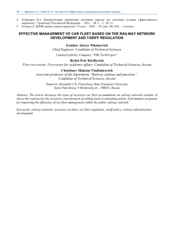 ИВАНКОВ А. Н., РЫБИН П. К., ЧЕТЧУЕВ М. В. ЭФФЕКТИВНОЕ УПРАВЛЕНИЕ ВАГОННЫМИ ПАРКАМИ НА ОСНОВЕ РАЗВИТИЯ ЖЕЛЕЗНОДОРОЖНОЙ СЕТИ И ТАРИФНОГО РЕГУЛИРОВАНИЯ // БЮЛЛЕТЕНЬ УЧЕНОГО СОВЕТА АО "ИЭРТ". 2025. № 10-1