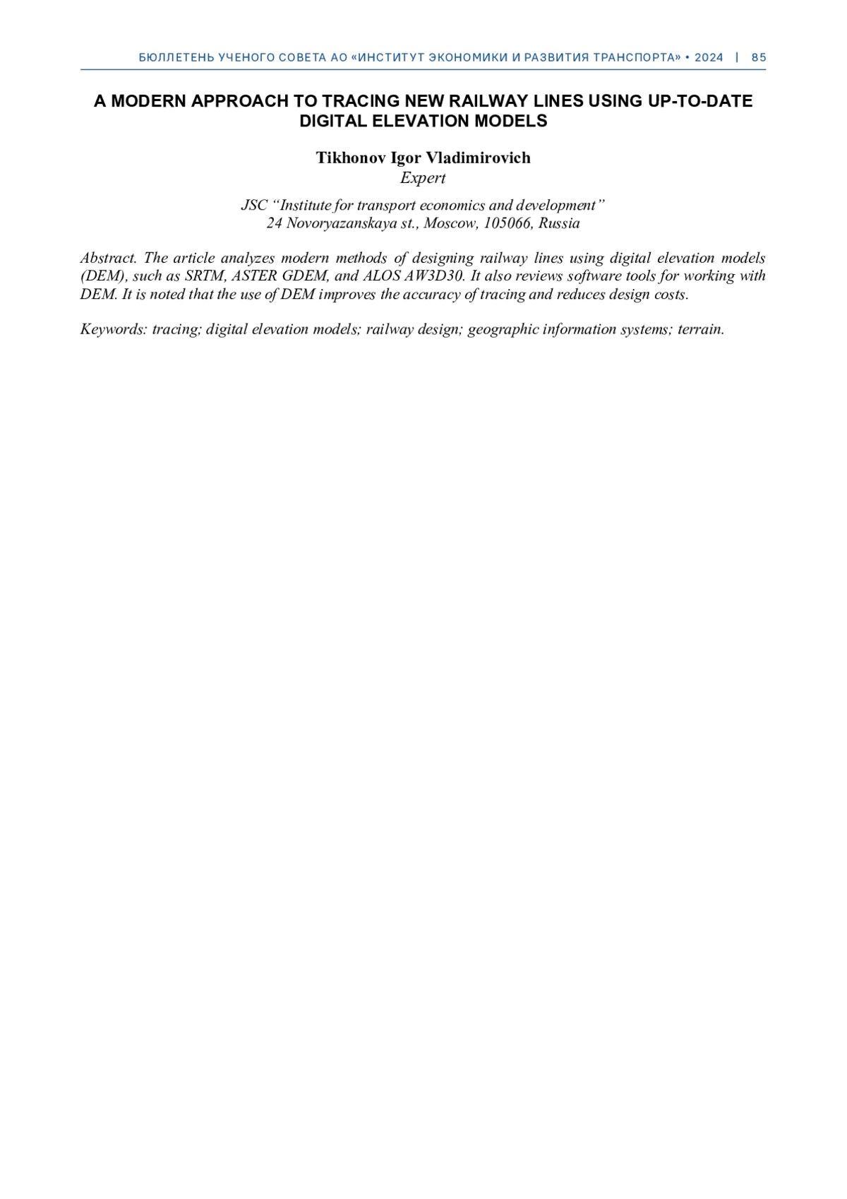 ТИХОНОВ И. В. СОВРЕМЕННЫЙ ПОДХОД К ВЫПОЛНЕНИЮ ТРАССИРОВАНИЯ НОВЫХ ЖЕЛЕЗНОДОРОЖНЫХ ЛИНИЙ С ПРИМЕНЕНИЕМ АКТУАЛЬНЫХ ЦИФРОВЫХ МОДЕЛЕЙ РЕЛЬЕФА МЕСТНОСТИ // БЮЛЛЕТЕНЬ УЧЕНОГО СОВЕТА АО "ИЭРТ". 2025. № 10-1
