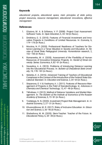 3. Мурзина Н. П. Профессиональная готовность учителей к дистанционному обучению в условиях напряженной ситуации в обществе и образовании // Вестник Омского государственного педагогического университета. Гуманитарные исследования. 2020. №2. С. 152-156.