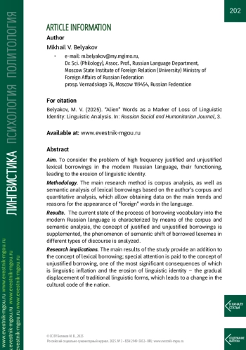 Цель. Рассмотреть проблему высокочастотных оправданных и неоправданных лексических заимствований в современном русском языке, их функционирование, приводящее к эрозии языковой идентичности.