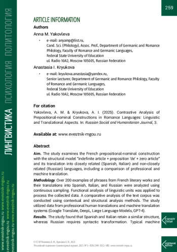 Цель. В исследовании анализируются французская предложно-именная конструкция со структурной моделью «неопределённый артикль главное существительное + предлог de + нулевой артикль зависимое существительное» и её переводы на близкородственные (испанский, итальянский) и неблизкородственные (русский) языки, включая сравнение профессионального и машинного перевода.