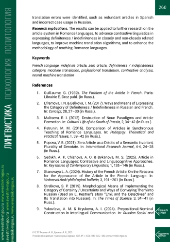2. Ефремова И. Н., Белкова Т. М. Способы и средства выражения категории определенности / неопределенности в русском и французском языках // Концепт. 2017. №28. С. 27-30.