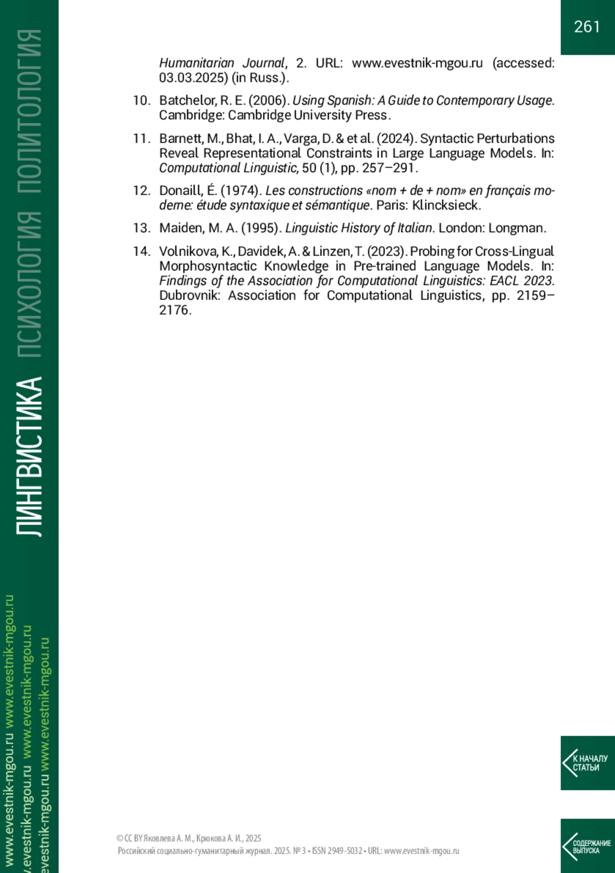 14. Volnikova K., Davidek A., Linzen T. Probing for Cross-Lingual Morphosyntactic Knowledge in Pre-trained Language Models // Findings of the Association for Computational Linguistics: EACL 2023. Dubrovnik: Association for Computational Linguistics, 2023. P. 2159-2176.