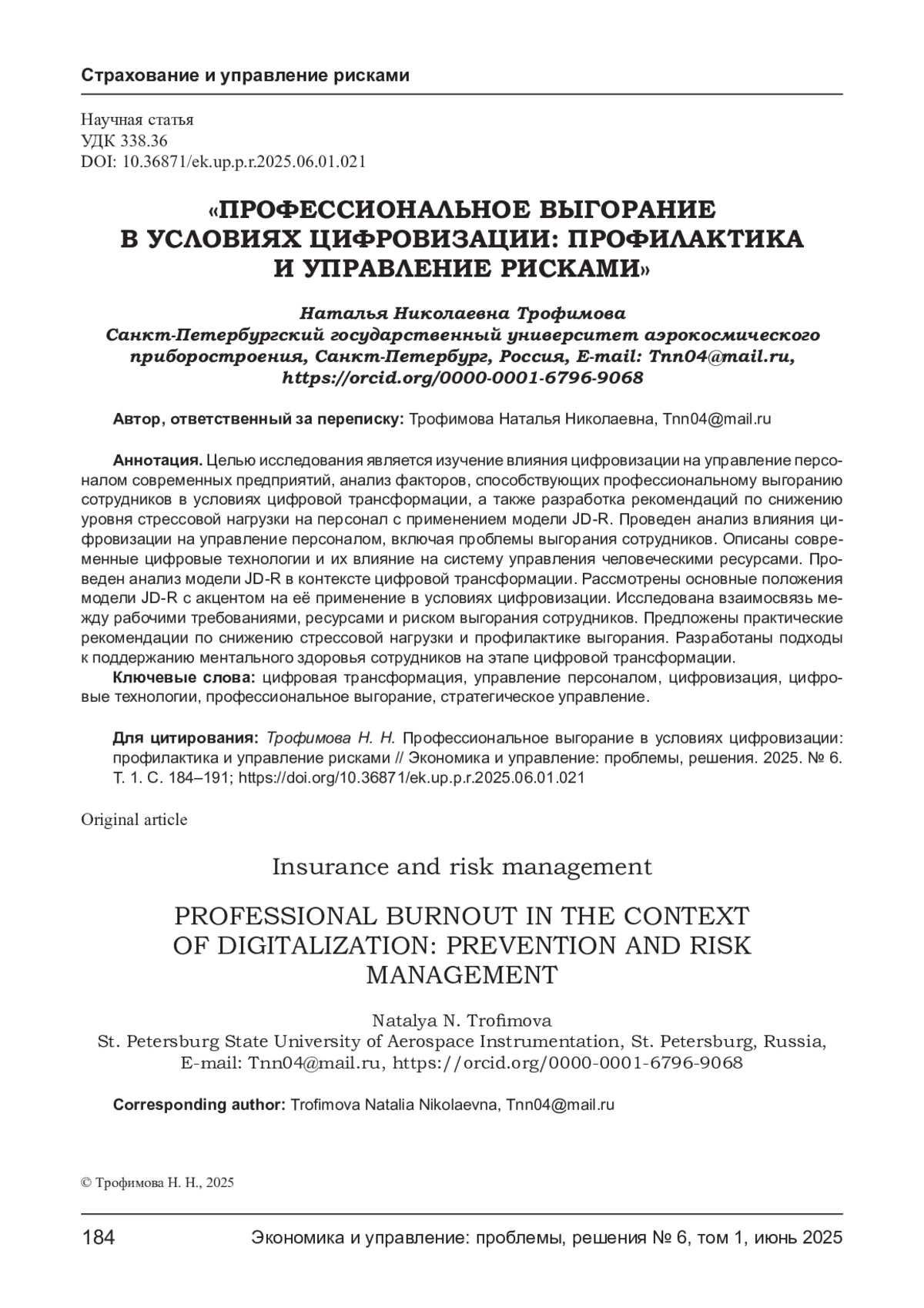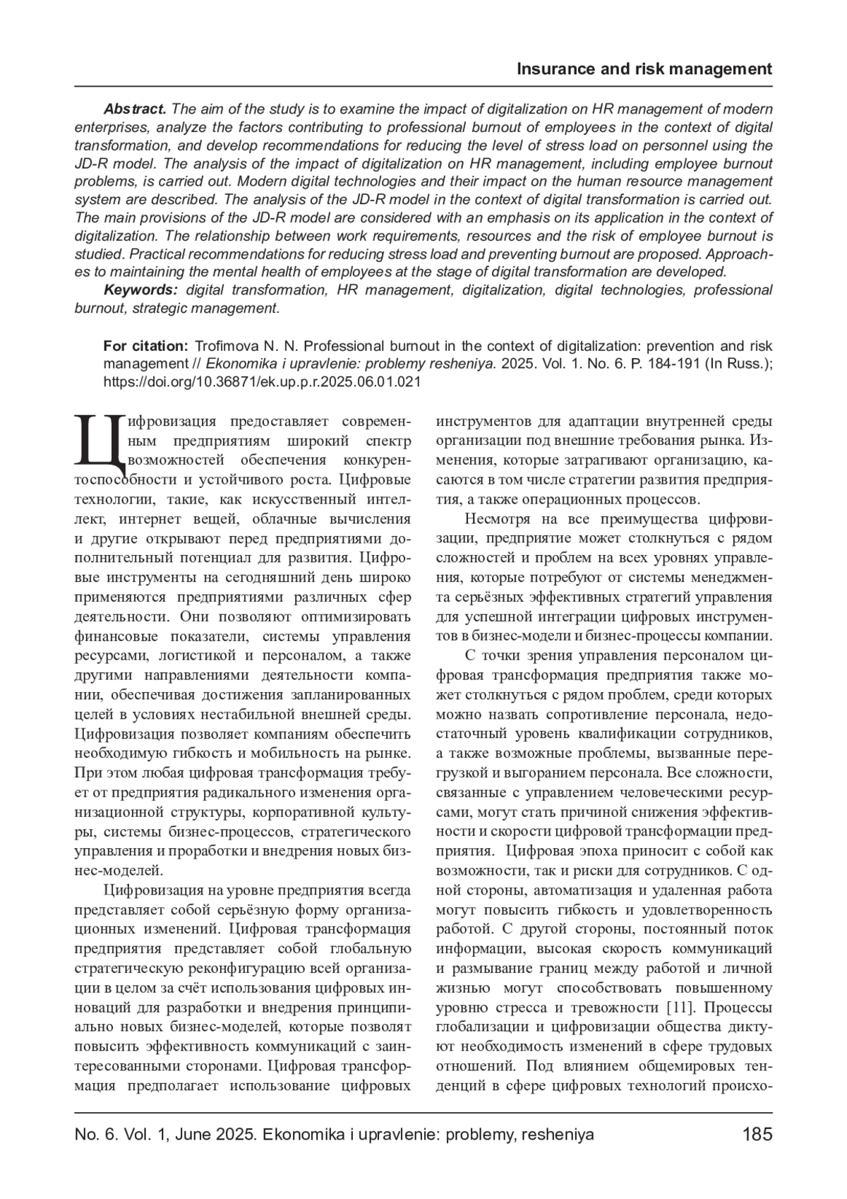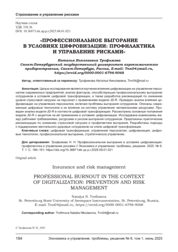 Целью исследования является изучение влияния цифровизации на управление персоналом современных предприятий, анализ факторов, способствующих профессиональному выгоранию сотрудников в условиях цифровой трансформации, а также разработка рекомендаций по снижению уровня стрессовой нагрузки на персонал с применением модели JD-R. Проведен анализ влияния цифровизации на управление персоналом, включая проблемы выгорания сотрудников. Описаны современные цифровые технологии и их влияние на систему управления человеческими ресурсами. Проведен анализ модели JD-R в контексте цифровой трансформации. Рассмотрены основные положения модели JD-R с акцентом на её применение в условиях цифровизации. Исследована взаимосвязь между рабочими требованиями, ресурсами и риском выгорания сотрудников. Предложены практические рекомендации по снижению стрессовой нагрузки и профилактике выгорания. Разработаны подходы к поддержанию ментального здоровья сотрудников на этапе цифровой трансформации.