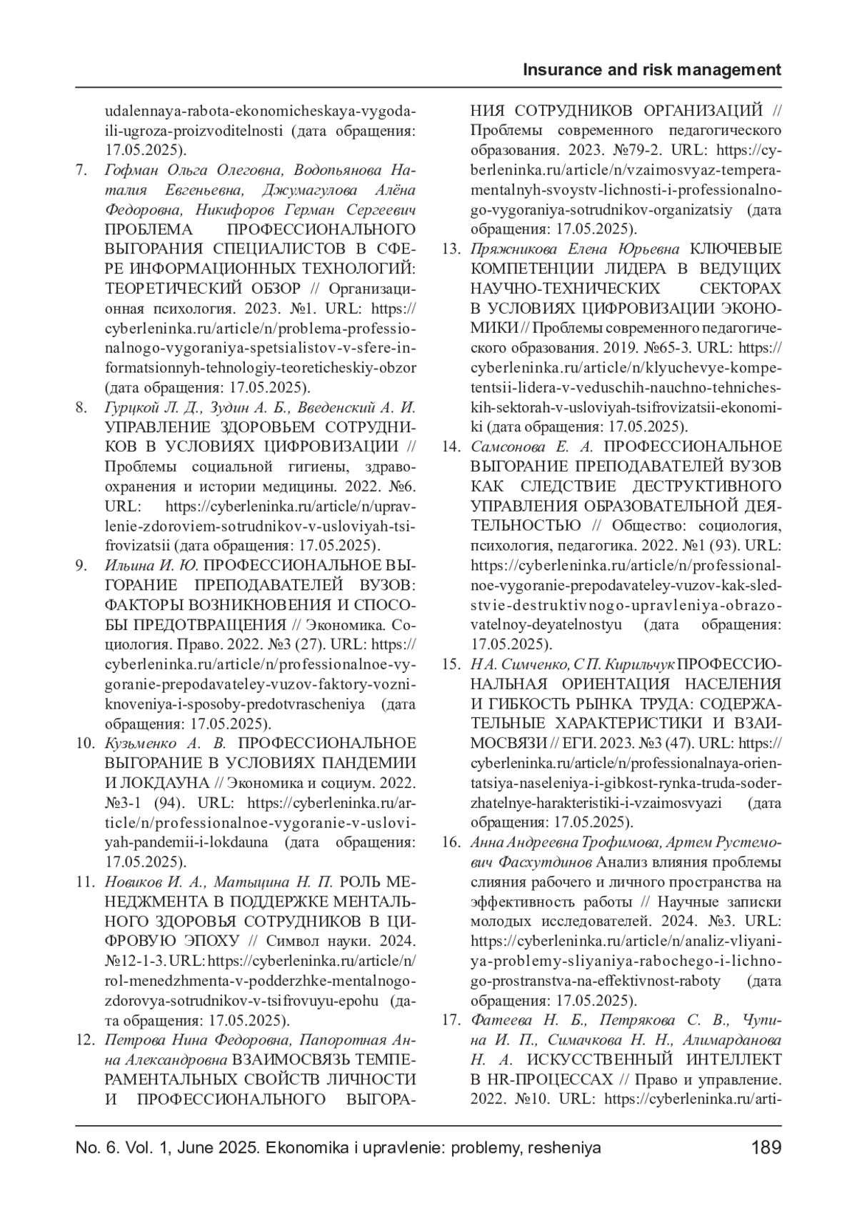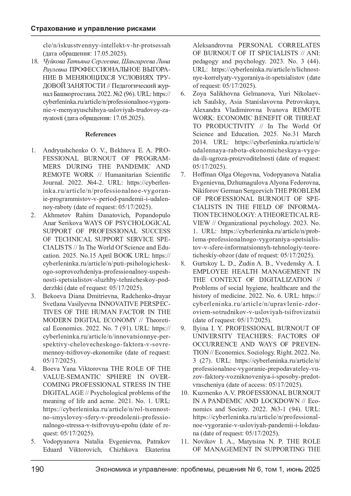 7. Гофман Ольга Олеговна, Водопьянова Наталия Евгеньевна, Джумагулова Алёна Федоровна, Никифоров Герман Сергеевич ПРОБЛЕМА ПРОФЕССИОНАЛЬНОГО ВЫГОРАНИЯ СПЕЦИАЛИСТОВ В СФЕРЕ ИНФОРМАЦИОННЫХ ТЕХНОЛОГИЙ: ТЕОРЕТИЧЕСКИЙ ОБЗОР // Организационная психология. 2023. №1. URL: https://cyberleninka.ru/article/n/problema-professionalnogo-vygoraniya-spetsialistov-v-sfere-informatsionnyh-tehnologiy-teoreticheskiy-obzor (дата обращения: 17.05.2025).