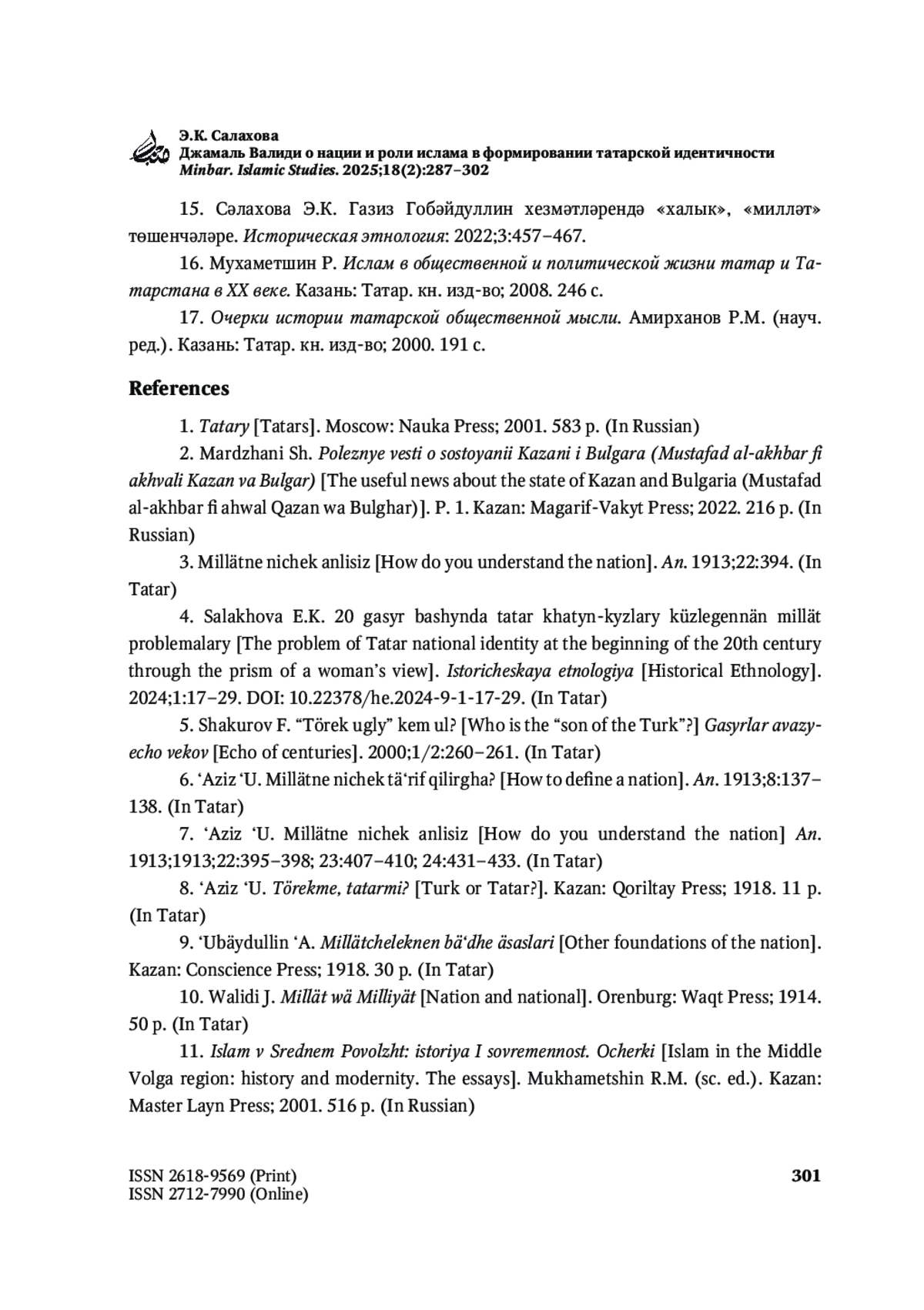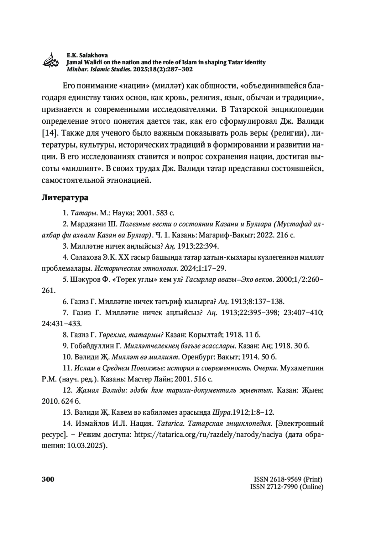 15. Сәлахова Э.К. Газиз Гобәйдуллин хезмәтләрендә «халык», «милләт» төшенчәләре. Историческая этнология: 2022;3:457-467.