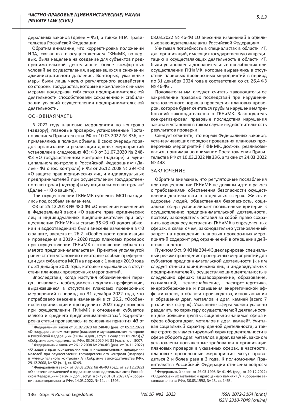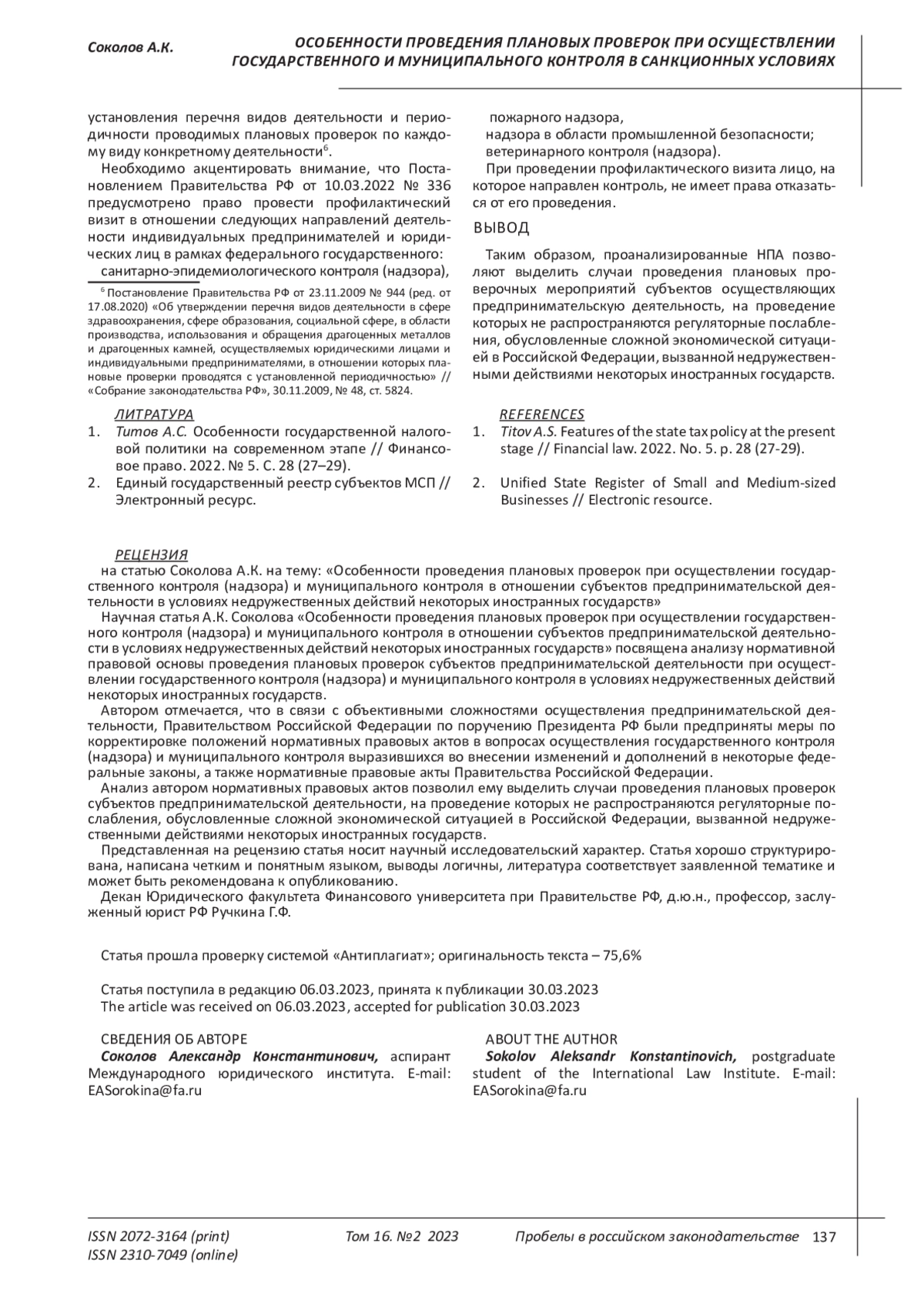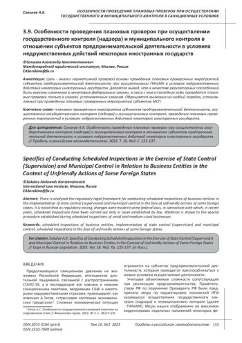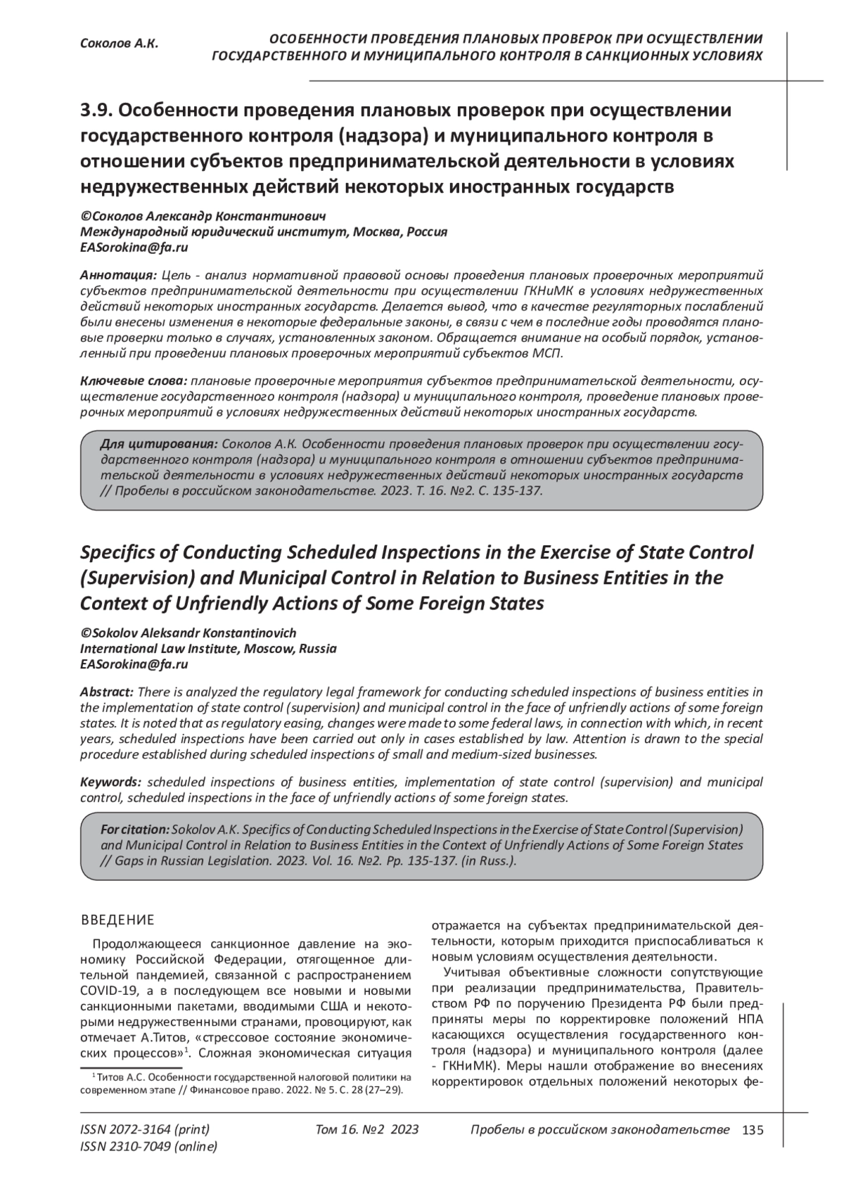 СОКОЛОВ А. Д. ОСОБЕННОСТИ ПРОВЕДЕНИЯ ПЛАНОВЫХ ПРОВЕРОК ПРИ ОСУЩЕСТВЛЕНИИ ГОСУДАРСТВЕННОГО КОНТРОЛЯ (НАДЗОРА) И МУНИЦИПАЛЬНОГО КОНТРОЛЯ В ОТНОШЕНИИ СУБЪЕКТОВ ПРЕДПРИНИМАТЕЛЬСКОЙ ДЕЯТЕЛЬНОСТИ В УСЛОВИЯХ НЕДРУЖЕСТВЕННЫХ ДЕЙСТВИЙ НЕКОТОРЫХ ИНОСТРАННЫХ ГОСУДАРСТВ // ПРОБЕЛЫ В РОССИЙСКОМ ЗАКОНОДАТЕЛЬСТВЕ. 2023. Т. 16 № 2
