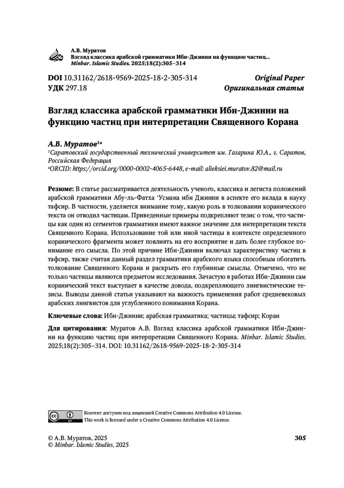 1. Муратов А.В. Толкование Коранических слов через призму теории «Аль-Иштикак аль-акбар» Ибн Джинни. Minbar. Islamic Studies. 2023;16(4):805-815. https://doi.org/10.31162/2618-9569-2023-16-4-805-815