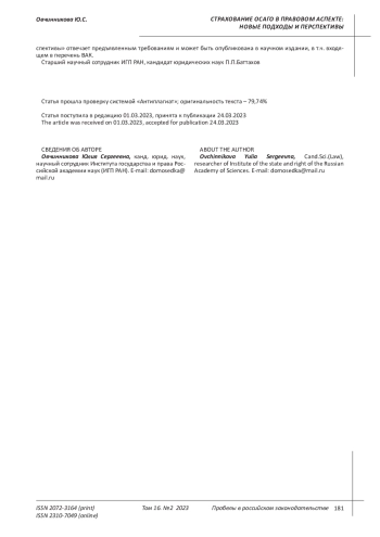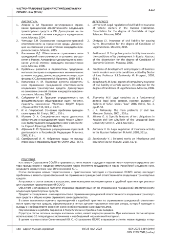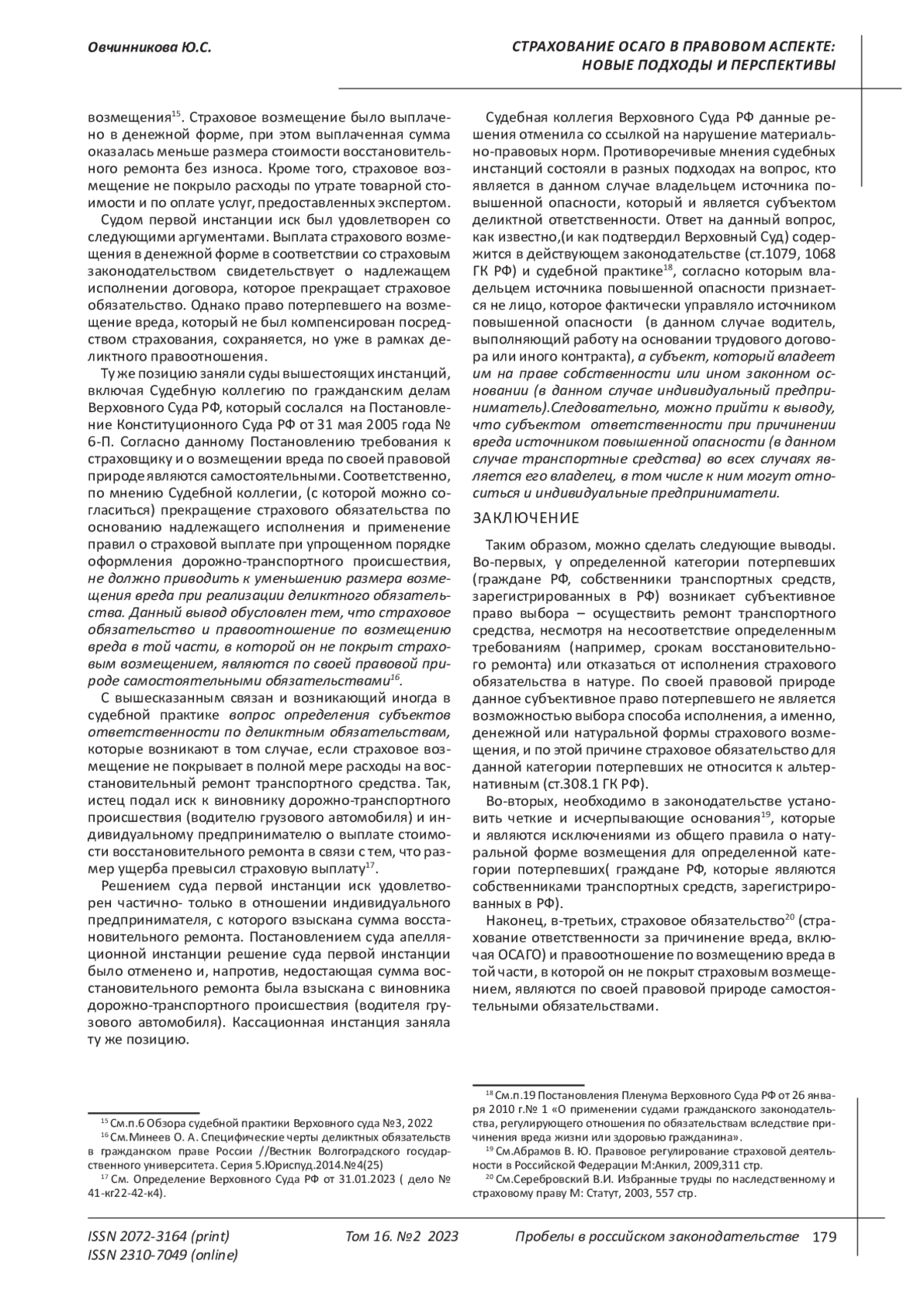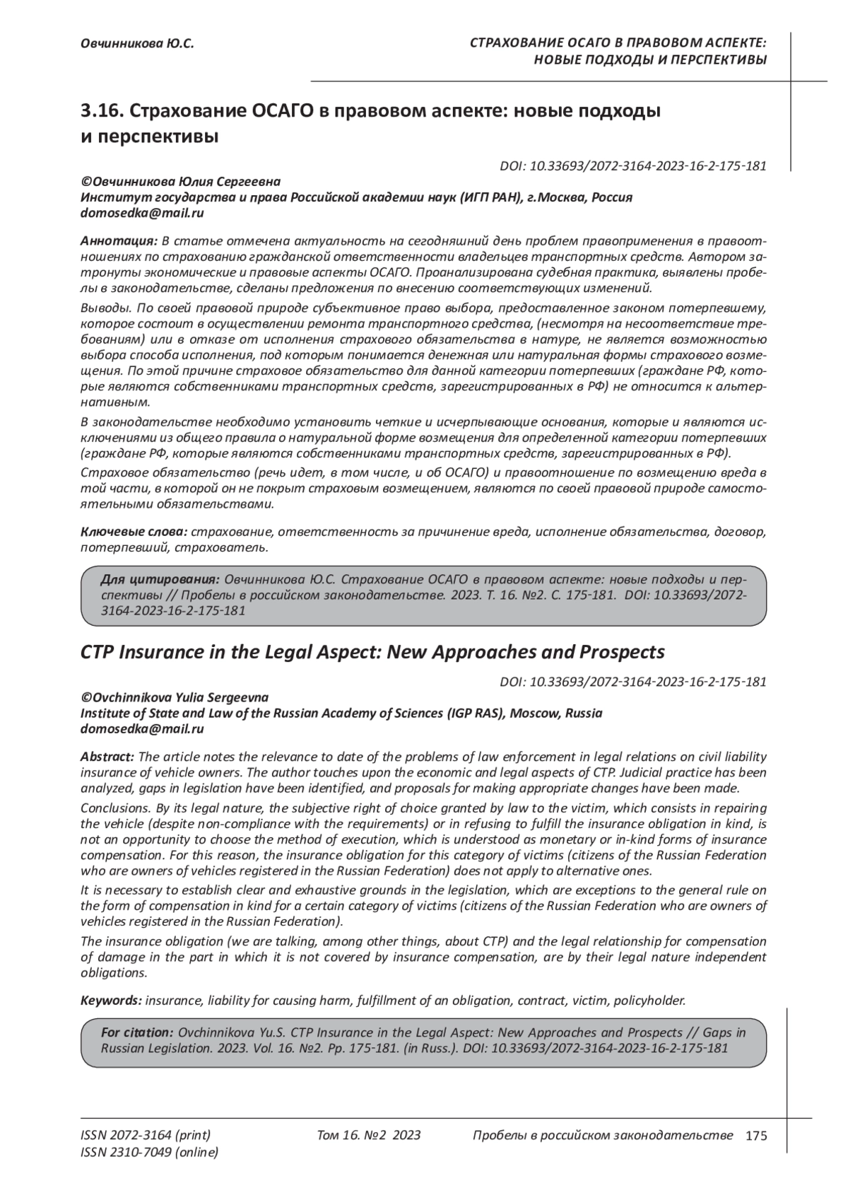 ОВЧИННИКОВА Ю. С. СТРАХОВАНИЕ ОСАГО В ПРАВОВОМ АСПЕКТЕ: НОВЫЕ ПОДХОДЫ И ПЕРСПЕКТИВЫ // ПРОБЕЛЫ В РОССИЙСКОМ ЗАКОНОДАТЕЛЬСТВЕ. 2023. Т. 16 № 2