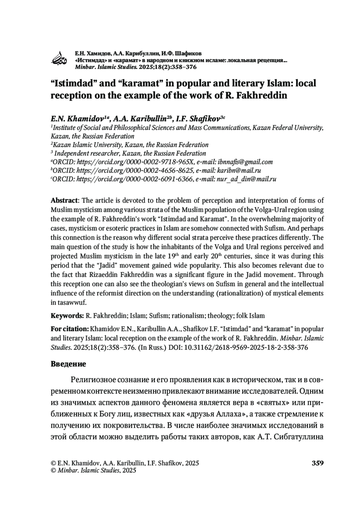 Статья посвящена проблеме восприятия и интерпретации форм мусульманского мистицизма различными слоями мусульманского населения Волго-Уральского региона на примере работы Р. Фахреддина «Истимдад и карамат». В подавляющем большинстве случаев мистицизм и эзотерические практики в исламе так или иначе связаны с суфизмом. И, возможно, именно эта связь является причиной того, что разные социальные слои воспринимают данные практики по-разному. Главный вопрос исследования заключается в том, как жители Поволжья и Приуралья воспринимали и проецировали мусульманский мистицизм в конце XIX и начале XX веков, так как именно в этот период широкую популярность обретает «джадидитское» направление. Это также актуально в связи с тем, что Р. Фахреддин был значимой фигурой джадидитского движения. Через данную рецепцию можно также увидеть взгляды богослова на суфизм в целом и интеллектуальное влияние реформаторского направления на осмысление (рационализацию) мистических элементов в тасаввуфе.
