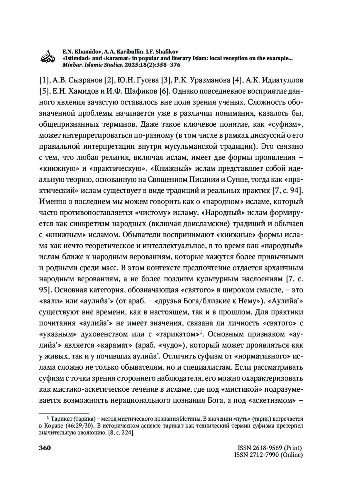 6. Шафиков И.Ф., Хамидов Е.Н. «Суфизм» и «народный ислам»: дискурс и восприятие в конце XIX - начале XX вв. Историческая этнология. 2023;8(1):33-46. https://doi.org/10.22378/he.2023-8-1.33-46