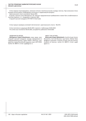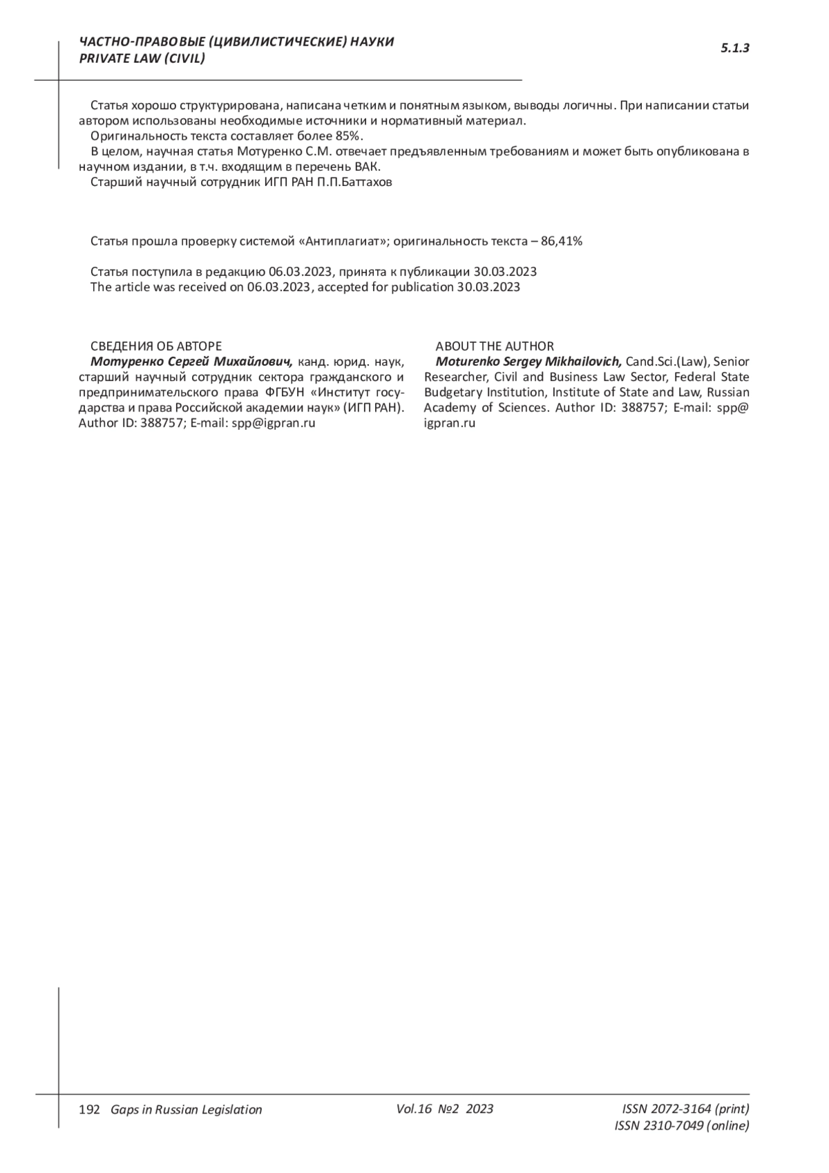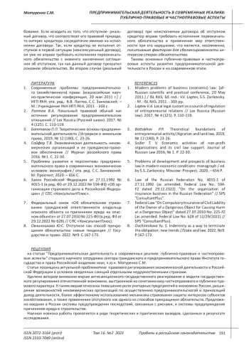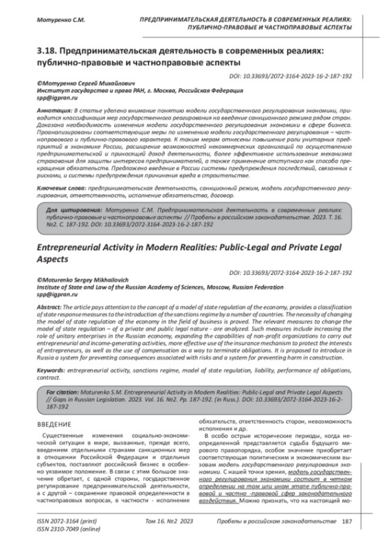 МОТУРЕНКО С. М. ПРЕДПРИНИМАТЕЛЬСКАЯ ДЕЯТЕЛЬНОСТЬ В СОВРЕМЕННЫХ РЕАЛИЯХ: ПУБЛИЧНО-ПРАВОВЫЕ И ЧАСТНОПРАВОВЫЕ АСПЕКТЫ // ПРОБЕЛЫ В РОССИЙСКОМ ЗАКОНОДАТЕЛЬСТВЕ. 2023. Т. 16 № 2