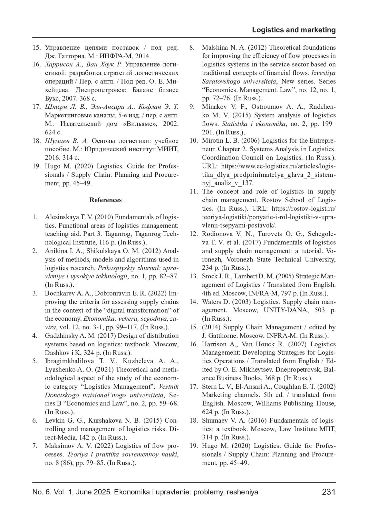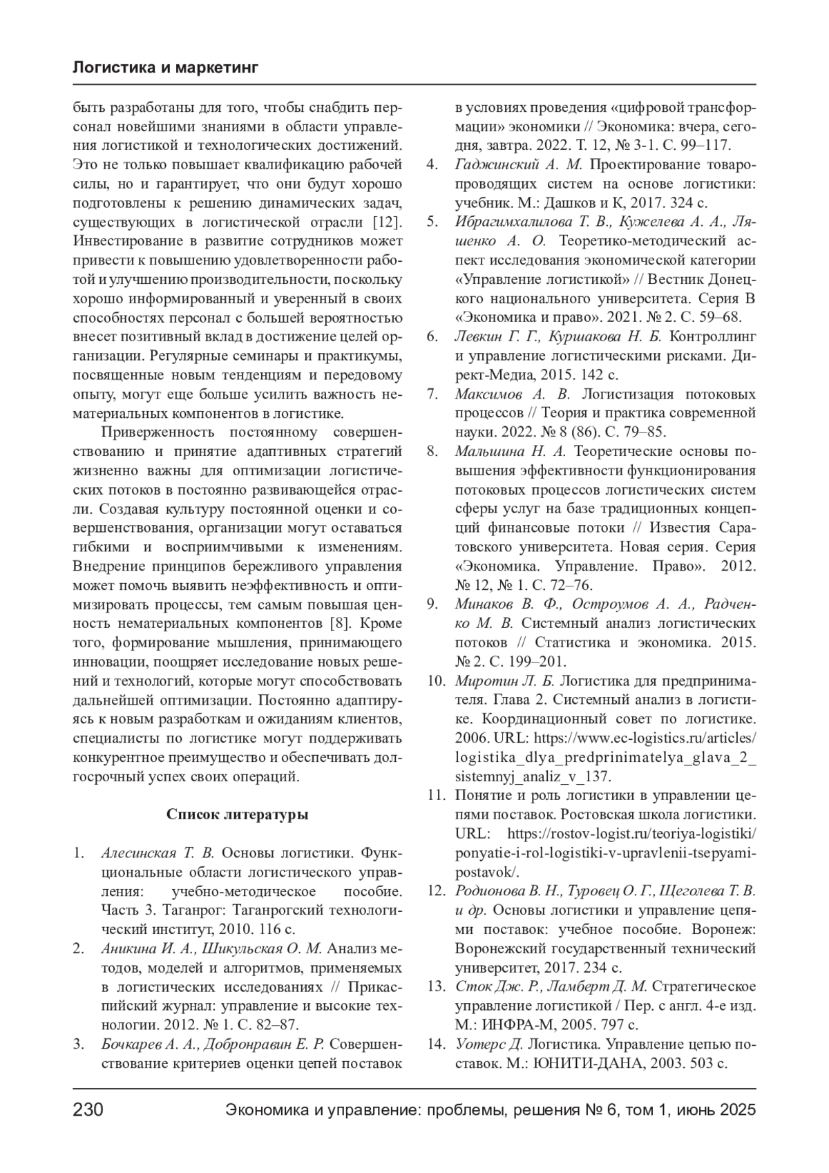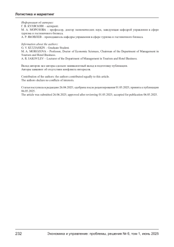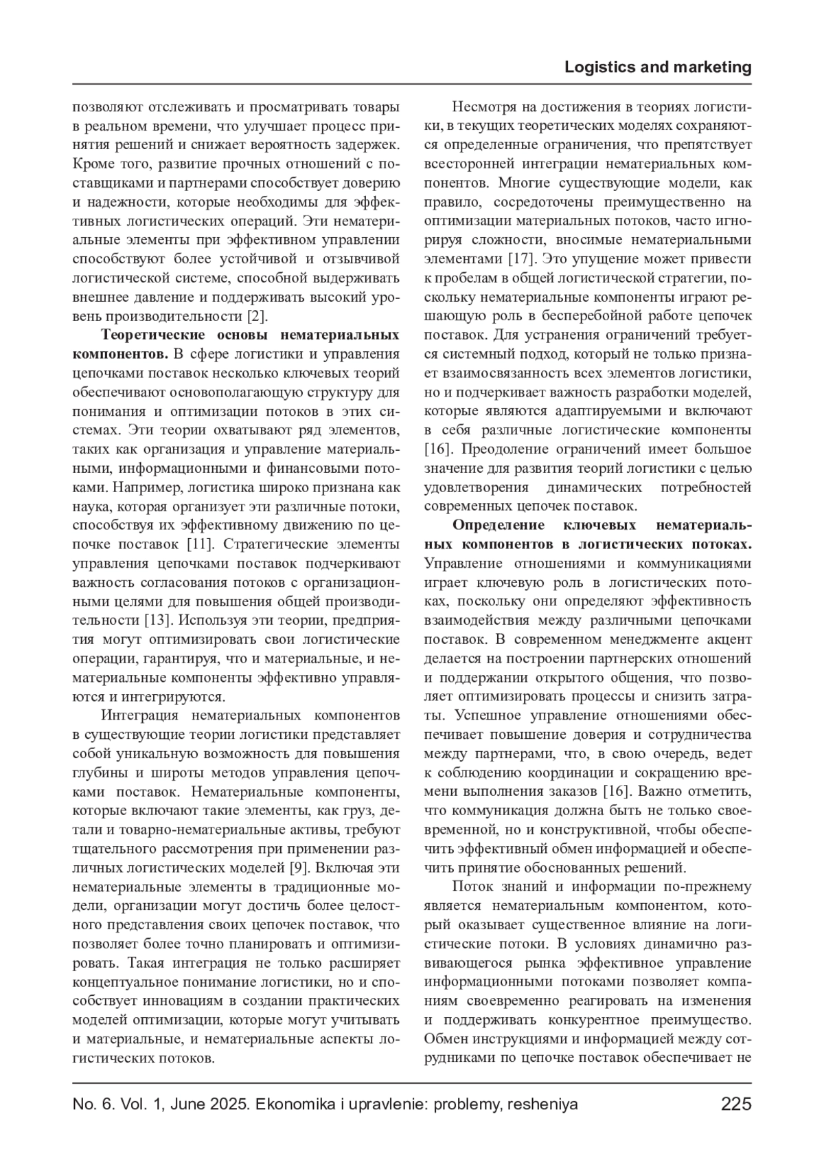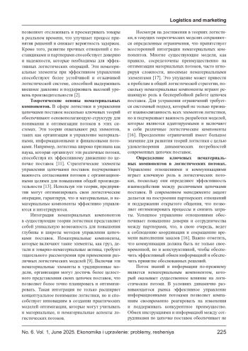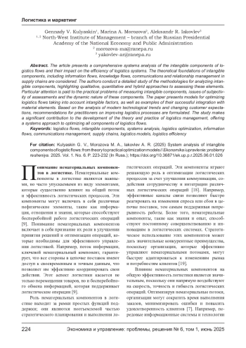 КУЛЯСКИН Г. В., МОРОЗОВА М. А., ЯКОВЛЕВ А. Р. СИСТЕМНЫЙ АНАЛИЗ НЕМАТЕРИАЛЬНЫХ СОСТАВЛЯЮЩИХ ЛОГИСТИЧЕСКИХ ПОТОКОВ: ОТ ТЕОРИИ К ПРАКТИЧЕСКИМ МОДЕЛЯМ ОПТИМИЗАЦИИ // ЭКОНОМИКА И УПРАВЛЕНИЕ: ПРОБЛЕМЫ, РЕШЕНИЯ. 2025. ТОМ 1 № 6