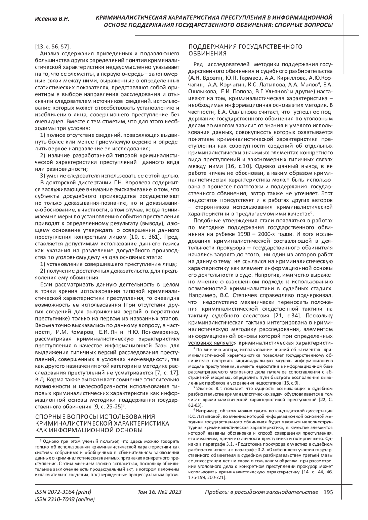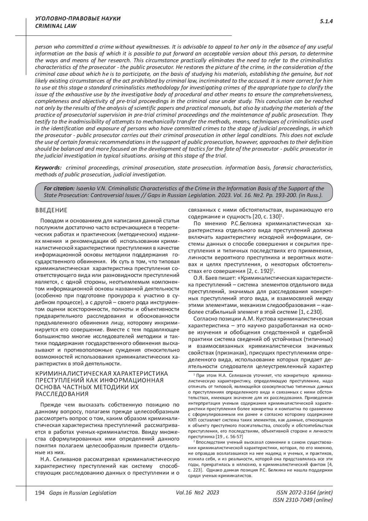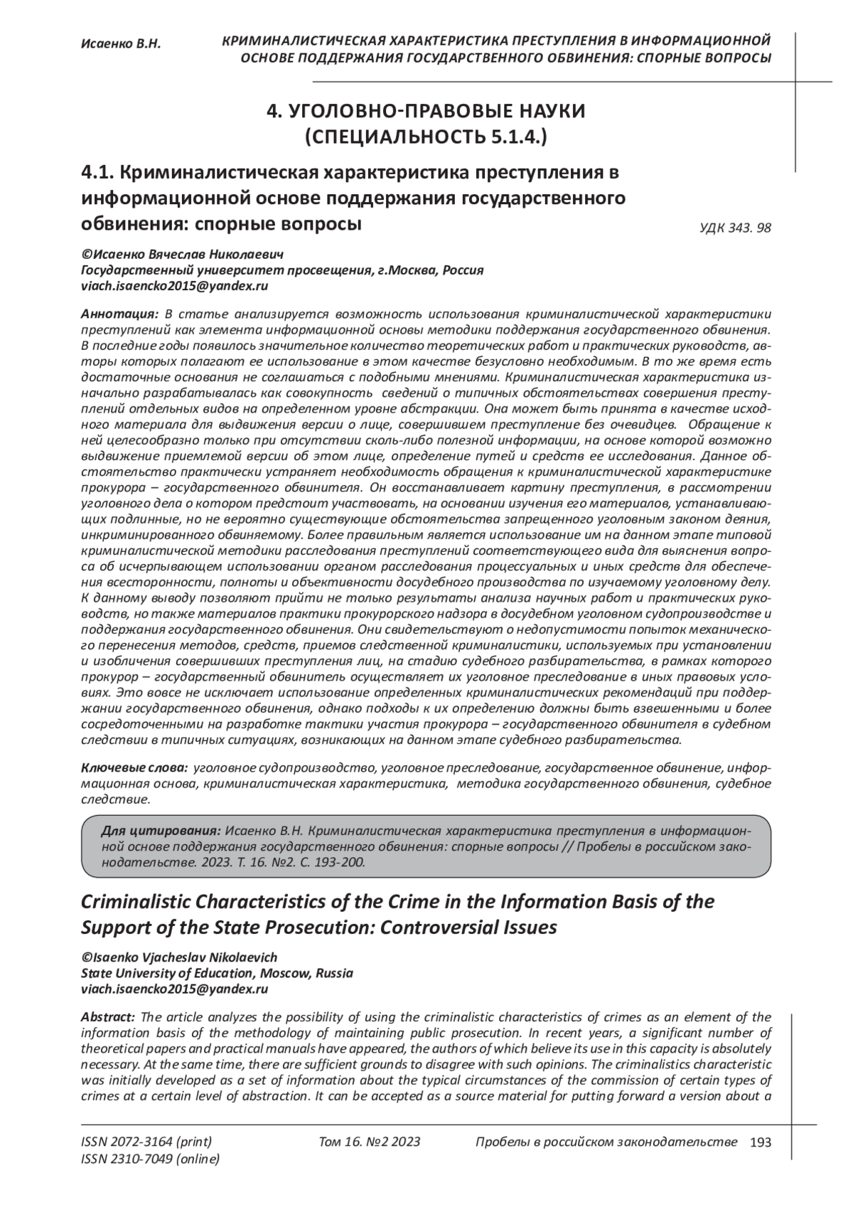 ИСАЕНКО В. Н. КРИМИНАЛИСТИЧЕСКАЯ ХАРАКТЕРИСТИКА ПРЕСТУПЛЕНИЯ В ИНФОРМАЦИОННОЙ ОСНОВЕ ПОДДЕРЖАНИЯ ГОСУДАРСТВЕННОГО ОБВИНЕНИЯ: СПОРНЫЕ ВОПРОСЫ // ПРОБЕЛЫ В РОССИЙСКОМ ЗАКОНОДАТЕЛЬСТВЕ. 2023. Т. 16 № 2