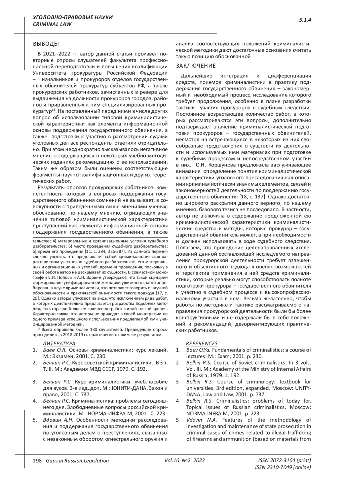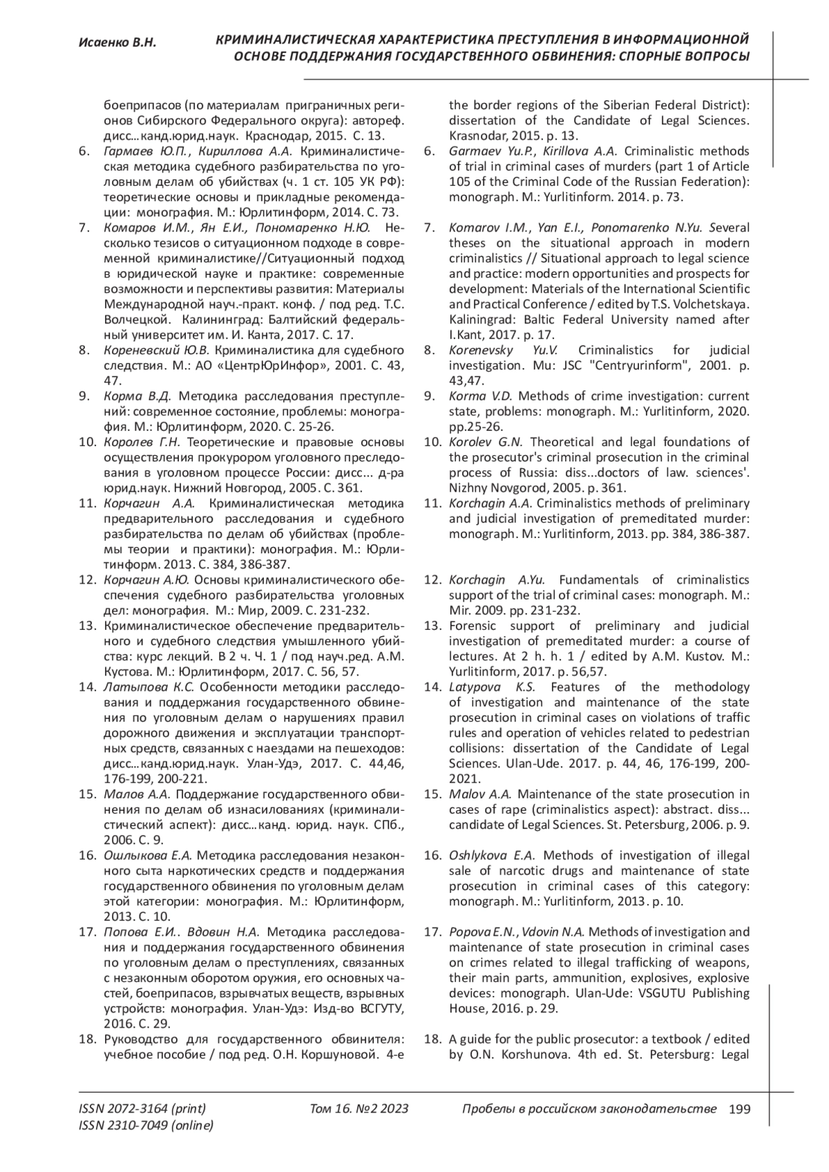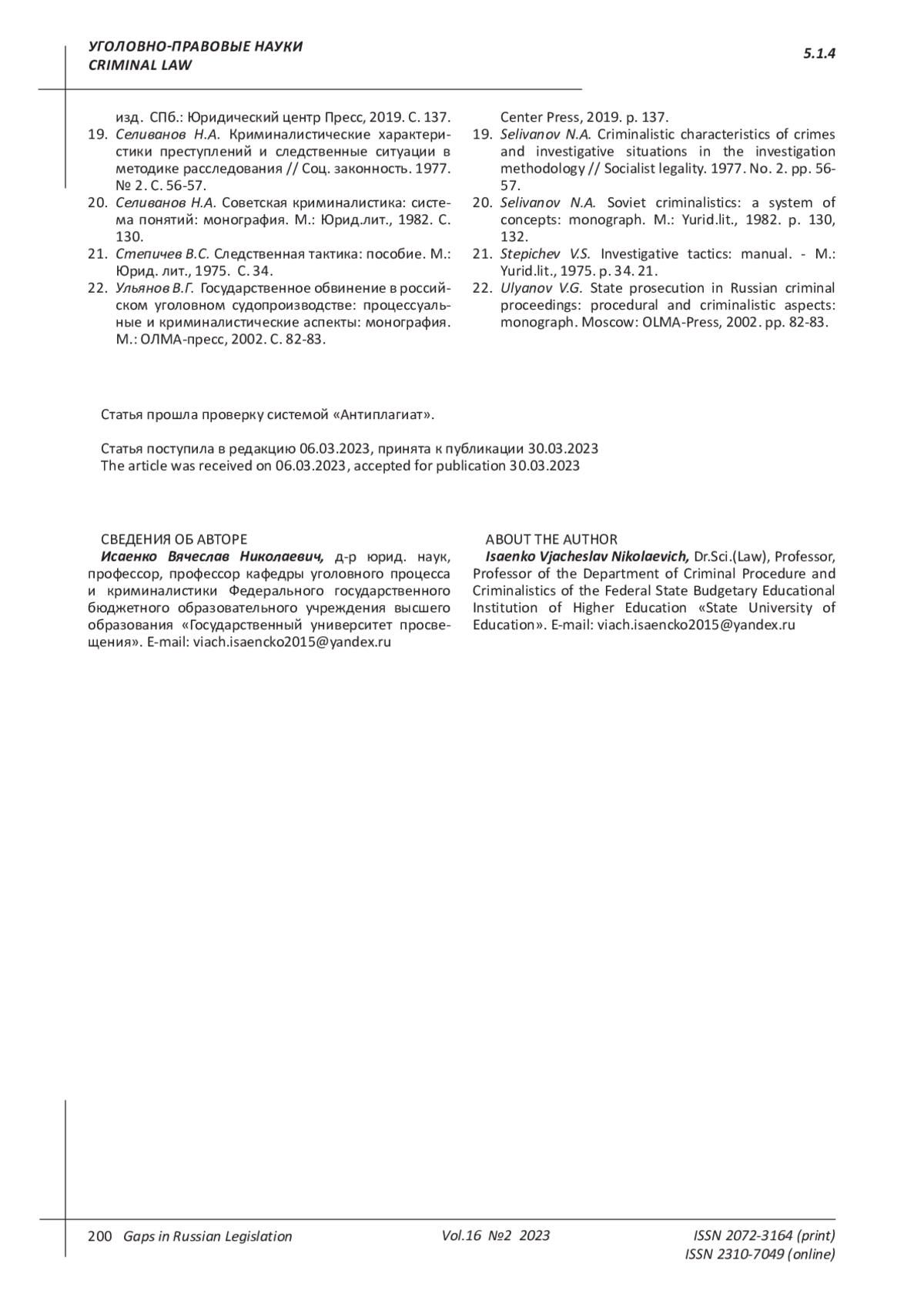 ИСАЕНКО В. Н. КРИМИНАЛИСТИЧЕСКАЯ ХАРАКТЕРИСТИКА ПРЕСТУПЛЕНИЯ В ИНФОРМАЦИОННОЙ ОСНОВЕ ПОДДЕРЖАНИЯ ГОСУДАРСТВЕННОГО ОБВИНЕНИЯ: СПОРНЫЕ ВОПРОСЫ // ПРОБЕЛЫ В РОССИЙСКОМ ЗАКОНОДАТЕЛЬСТВЕ. 2023. Т. 16 № 2