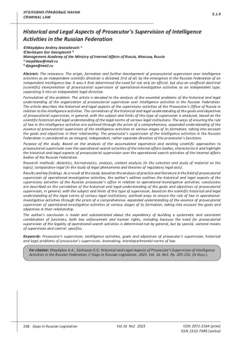 Актуальность. Зарождение, становление и дальнейшее развитие прокурорского надзора за оперативно-розыскной деятельностью в качестве самостоятельного научного направления продиктовано, прежде всего, возникновением в Российской Федерации самостоятельного оперативно-розыскного права. Именно оно определило необходимость не только официального, но и неофициального доктринального (научного) толкования прокурорского надзора за оперативно-розыскной деятельностью в качестве самостоятельного вида, выделения его в самостоятельное правовое направление. Постановка проблемы. Статья посвящена анализу существенных проблем историко-правового осмысления организации прокурорского надзора за оперативно-розыскной деятельностью в Российской Федерации. В статье рассмотрены историко-правовые аспекты надзорной деятельности прокуратуры России в отношении оперативно-розыскной деятельности. Анализируется соотношение историко-правового понимания целей и задач прокурорского надзора в целом с предметом и пределами этого вида надзора на основе научного историко-правового понимания правовых норм различных правовых институтов. Намечены пути обеспечения законности в оперативно-розыскной деятельности через призму комплексного и расширенного понимания сущности прокурорского надзора за оперативно-розыскной деятельностью на различных этапах ее формирования с учетом целей и задач в их взаимосвязи. Прокурорский надзор за оперативно-розыскной деятельностью в Российской Федерации рассматривается как неотъемлемое, самостоятельное, достаточно обособленное направление прокурорских функций. Цель исследования. На основе анализа накопленного опыта и существующих научных подходов к прокурорскому надзору за оперативно-розыскной деятельностью органов внутренних дел охарактеризовать его и выделить историко-правовые аспекты прокурорского надзора за оперативно-розыскной деятельностью органов внутренних дел Российской Федерации. Методы исследования: диалектика, герменевтика, анализ, контент-анализ (при подборе и изучении материала по теме); сравнительно-правовой (при изучении правовых явлений и теорий нормативных правовых актов). Результаты и ключевые выводы. В результате проведенного исследования, на основе анализа практики и литературы в сфере прокурорского надзора за оперативно-розыскной деятельностью в авторской редакции изложены историко-правовые аспекты надзорной деятельности прокуратуры России в соотнесении с оперативно-розыскной деятельностью; описаны выводы по соотношению историко-правового понимания целей и задач прокурорского надзора, в целом, с предметом и пределами данного его вида, исходя из научного историко-правового осмысления юридических норм различных правовых институтов; очерчены пути обеспечения законности в оперативно-розыскной деятельности через призму комплексного, расширенного понимания сущности прокурорского надзора за оперативно-розыскной деятельностью на различных стадиях его формирования, учета целей и задач в их взаимосвязи. Сделан и обоснован авторский вывод о целесообразности выстраивания системного и последовательного сочетания функций, как правоохранительной, так и правозащитной, в том числе и потому, что необходимость прокурорского надзора за законностью оперативно-розыс
