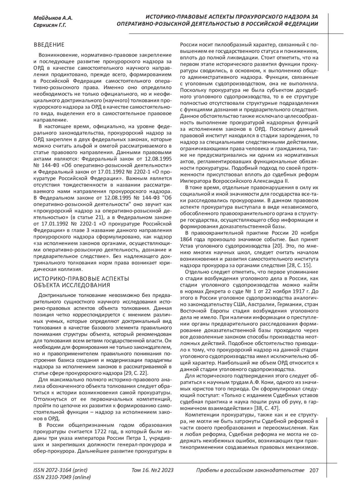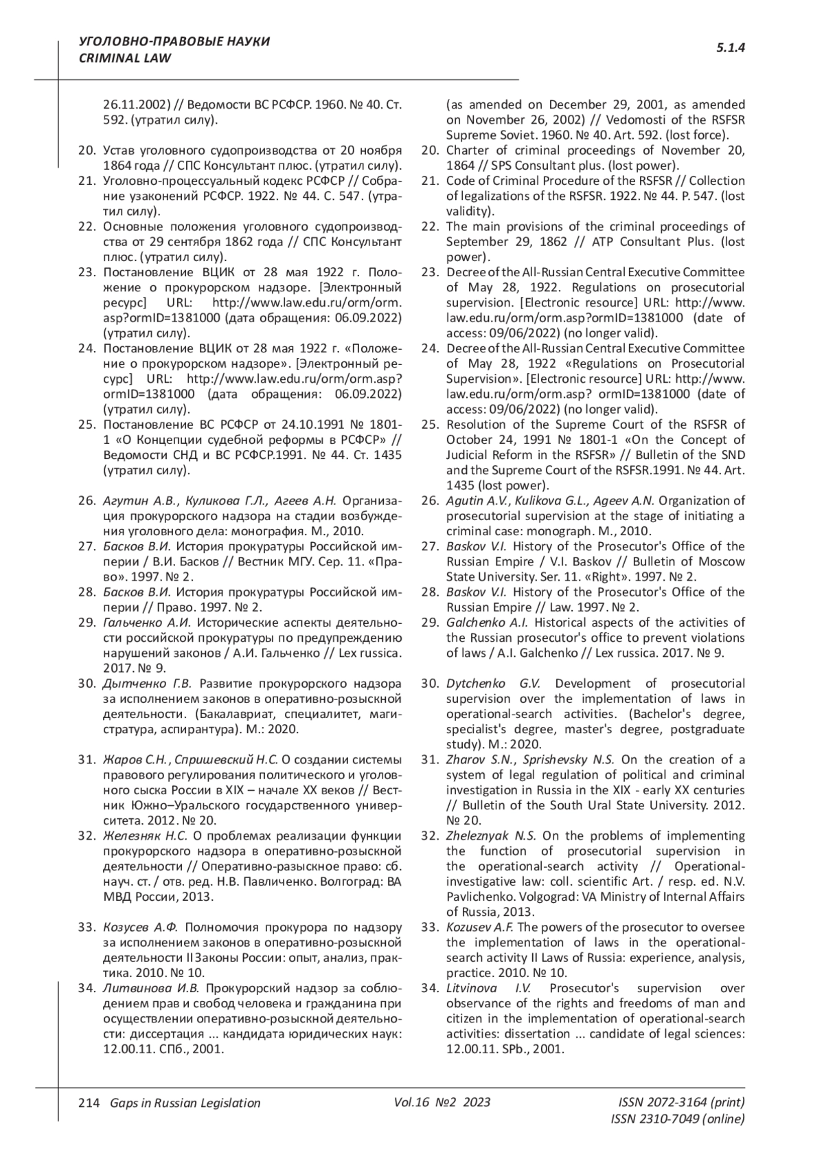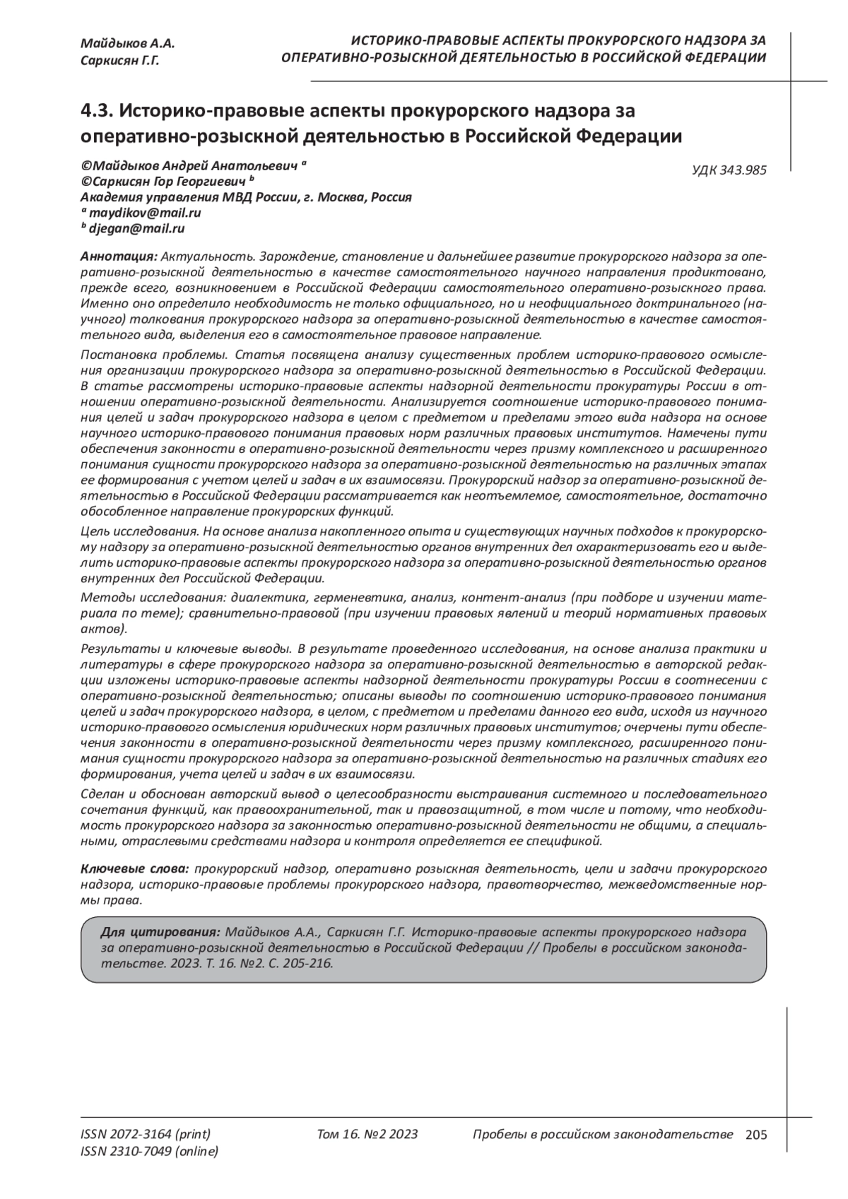 30. Дытченко Г.В. Развитие прокурорского надзора за исполнением законов в оперативно-розыскной деятельности. (Бакалавриат, специалитет, магистратура, аспирантура). М.: 2020. EDN: CVYHDB