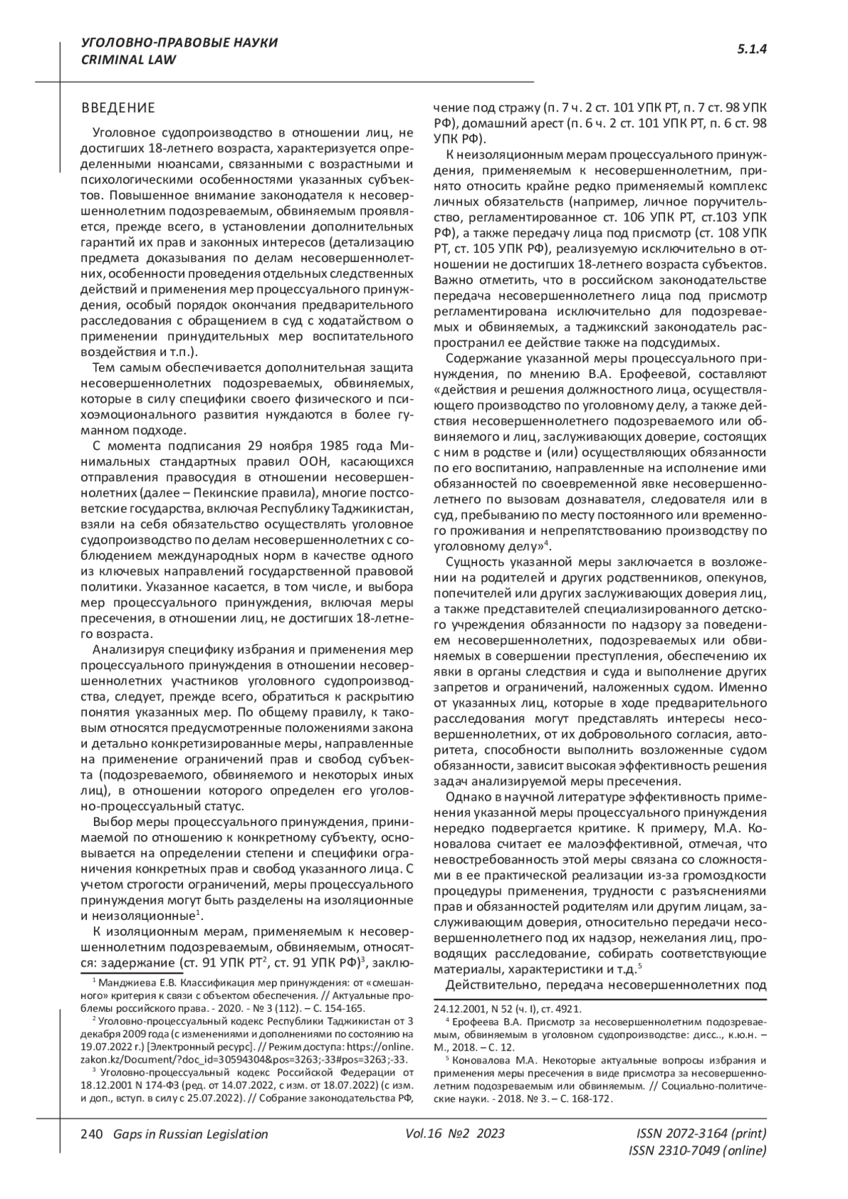 Статья: ОСОБЕННОСТИ ИЗБРАНИЯ И ПРИМЕНЕНИЯ МЕР ПРЕСЕЧЕНИЯ В ВИДЕ ПРИСМОТРА И ЗАПРЕТА ОПРЕДЕЛЕННЫХ ДЕЙСТВИЙ В ОТНОШЕНИИ НЕСОВЕРШЕННОЛЕТНИХ ПОДОЗРЕВАЕМЫХ, ОБВИНЯЕМЫХ (ПО ЗАКОНОДАТЕЛЬСТВУ РЕСПУБЛИКИ ТАДЖИКИСТАН И РОССИЙСКОЙ ФЕДЕРАЦИИ) (2023)