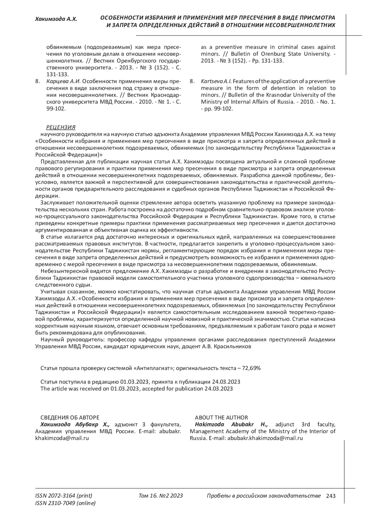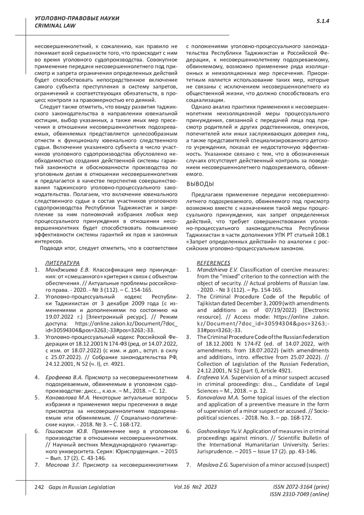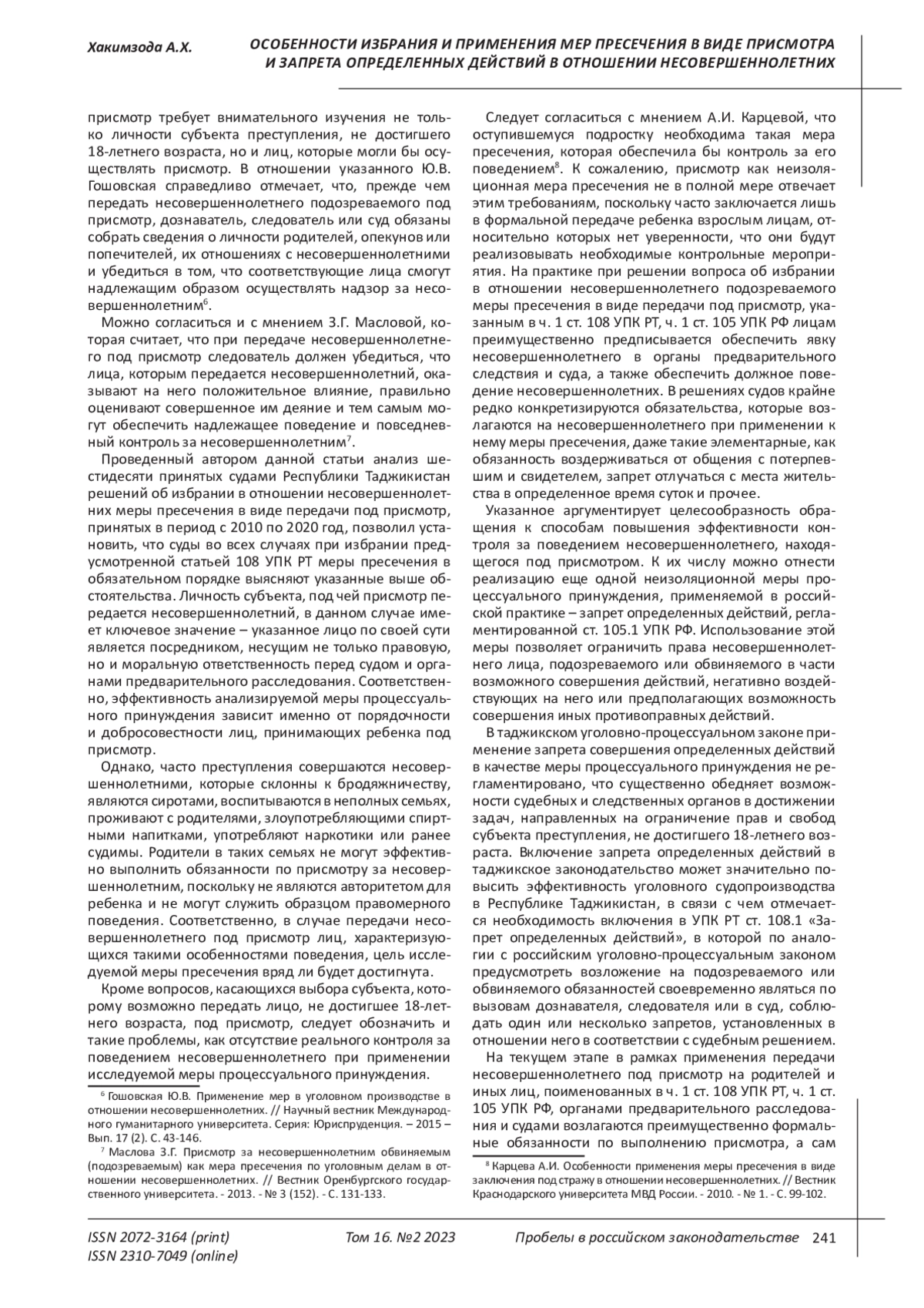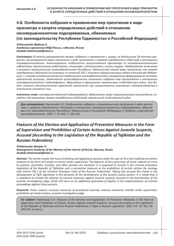 ХАКИМЗОДА А. Х. ОСОБЕННОСТИ ИЗБРАНИЯ И ПРИМЕНЕНИЯ МЕР ПРЕСЕЧЕНИЯ В ВИДЕ ПРИСМОТРА И ЗАПРЕТА ОПРЕДЕЛЕННЫХ ДЕЙСТВИЙ В ОТНОШЕНИИ НЕСОВЕРШЕННОЛЕТНИХ ПОДОЗРЕВАЕМЫХ, ОБВИНЯЕМЫХ (ПО ЗАКОНОДАТЕЛЬСТВУ РЕСПУБЛИКИ ТАДЖИКИСТАН И РОССИЙСКОЙ ФЕДЕРАЦИИ) // ПРОБЕЛЫ В РОССИЙСКОМ ЗАКОНОДАТЕЛЬСТВЕ. 2023. Т. 16 № 2