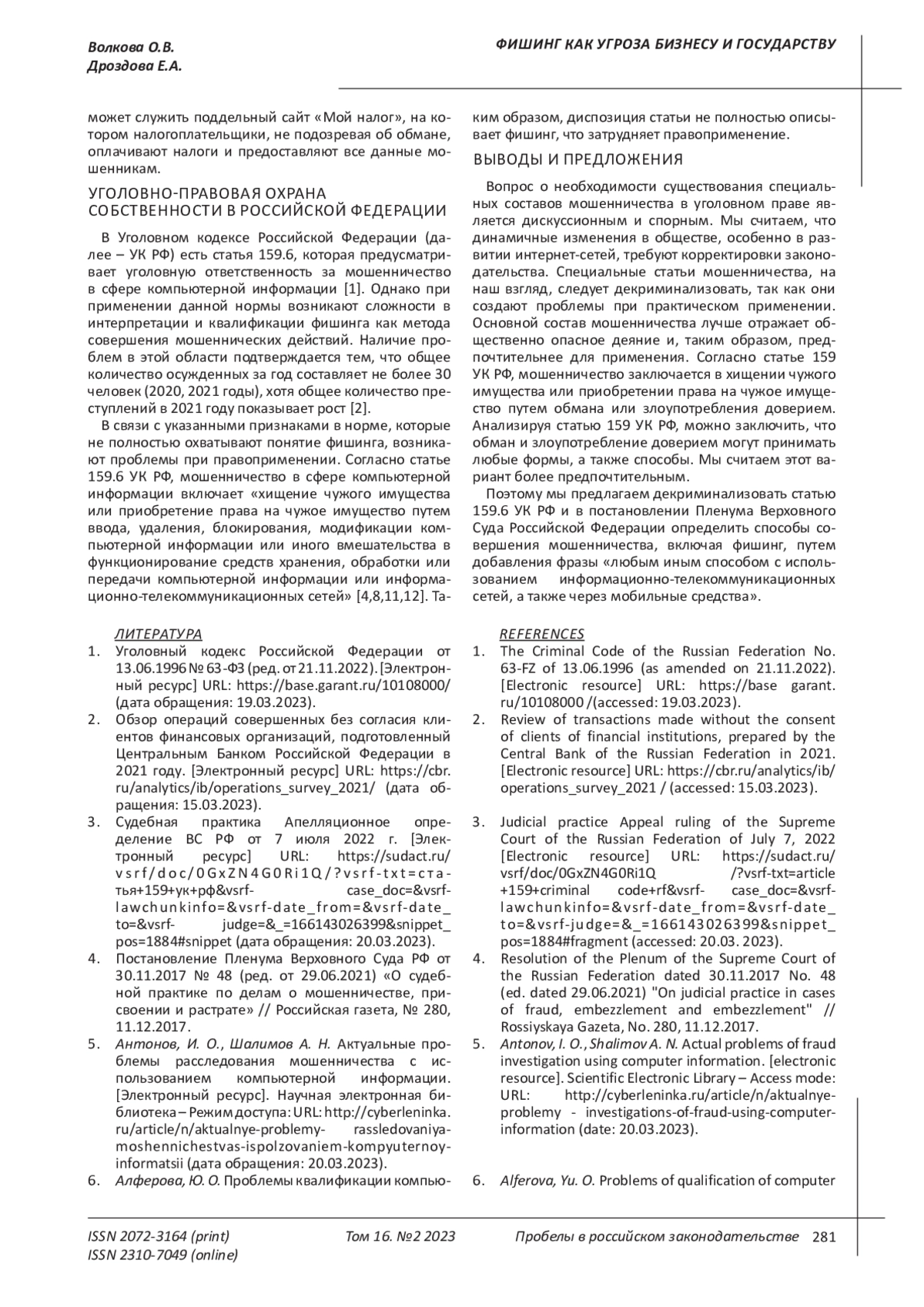 В данной статье акцент делается на актуальность проблем, связанных с угрозами мошеннических действий, затрагивающих бизнес и отдельных граждан. Подробно исследуется ситуация, связанная с хищением средств через телекоммуникационные каналы связи. Рассматривается распространенный метод мошенничества, который влияет на бизнес и граждан. В статье раскрывается понятие фишинга, а также анализируются нормы, касающиеся уголовно-правовой защиты этих отношений. Изучаются все виды мошенничества, предусмотренные Уголовным кодексом Российской Федерации. Целью исследования является демонстрация угрозы, которую мошенническая деятельность с использованием фишинга представляет для бизнеса и общества, и предложение способов решения этих проблем. Выводы. В результате исследования авторы предлагают внести изменения в постановление Пленума Верховного Суда Российской Федерации, касающиеся понятия фишинга и всех возможных способов мошенничества на современном этапе развития общества и государства. Для правоприменителей рекомендуется квалифицировать совершенные действия по статье 159 Уголовного кодекса Российской Федерации, так как данная норма охватывает весь спектр возможных способов. Кроме того, авторы предлагают декриминализовать статью 159.6 Уголовного кодекса Российской Федерации, поскольку она не отражает современную реальность и приводит к ошибкам при ее применении.