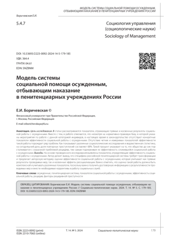Цель исследования. В статье рассматриваются показатели, отражающие прямые и косвенные результаты социальной работы с осужденными. Вместе с тем, в работе отмечается, что несмотря на нормативно-правовую базу, в которой указаны мероприятия по работе с данной категорией индивидов, в настоящее время в законодательстве отсутствуют конкретные показатели эффективности социальной работы с осужденными. Отсутствие четких и измеримых показателей эффективности такой работы порождает ряд проблем. Как показывают различные социологические исследования и ведомственная статистика, на сегодняшний день доля повторных преступлений составляет 68%. Такой процент указывает на то, что общество до сих пор сталкивается с серьезной проблемой рецидива, тем самым подчеркивая не эффективность сложившейся социальной работы с осужденными. Выводы. На основе проведенного исследования выявлены показатели, определяющие эффективность социальной работы с осужденными. Автор делает вывод, что специфика российской пенитенциарной системы требует трансформации и предлагает авторскую методику оценки эффективности социальной работы с осужденными, которая учитывает как прямые результаты проводимых мер, так и косвенные эффекты ресоциализации. Важно отметить, что оценка такой работы должна быть комплексной и учитывать различные показатели, поскольку важно получить достоверную информацию о результативности проводимых мер и внести необходимые коррективы в работу социальных служб.
