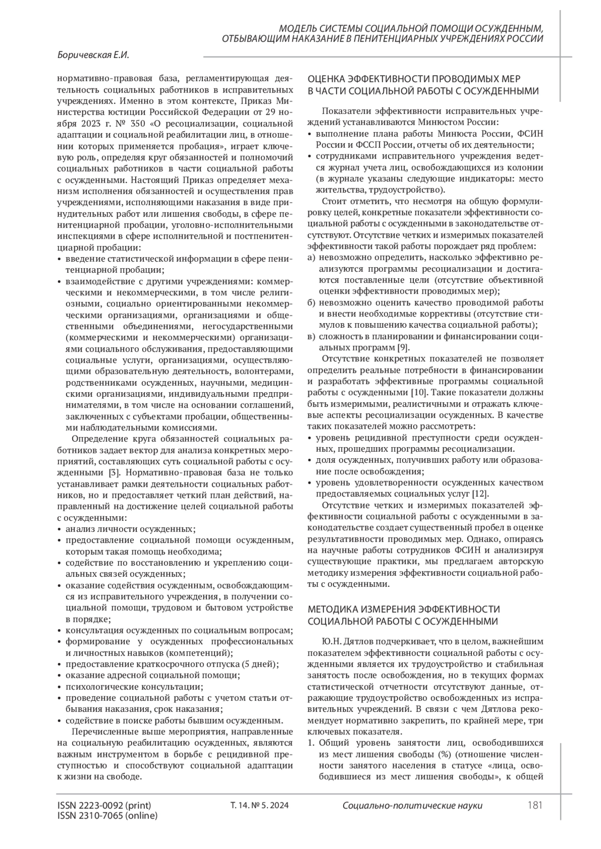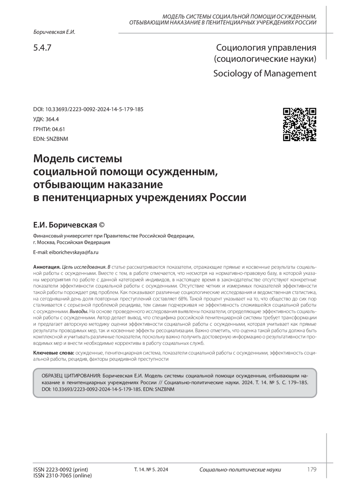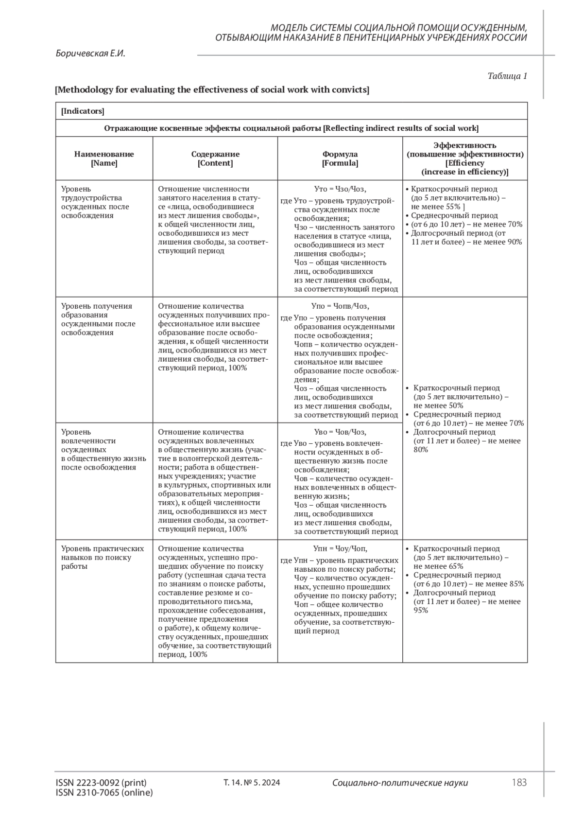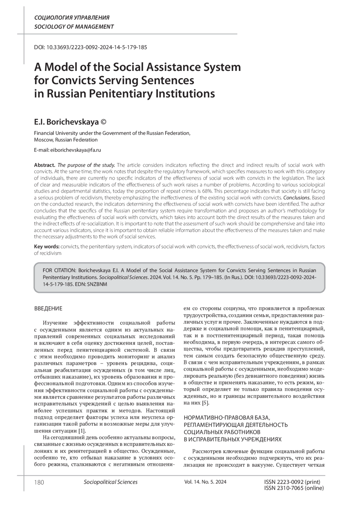 Изучение эффективности социальной работы с осужденными является одним из актуальных направлений современных социальных исследований и включают в себя оценку достижения целей, поставленных перед пенитенциарной системой. В связи с этим необходимо проводить мониторинг и анализ различных параметров – уровень рецидива, социальная реабилитация осужденных (в том числе лиц, отбывших наказание), их уровень образования и профессиональной подготовки. Одним из способов изучения эффективности социальной работы с осужденными является сравнение результатов работы различных исправительных учреждений с целью выявления наиболее успешных практик и методов. Настоящий подход определяет факторы успеха или неуспеха организации такой работы и возможные меры для улучшения ситуации [1].