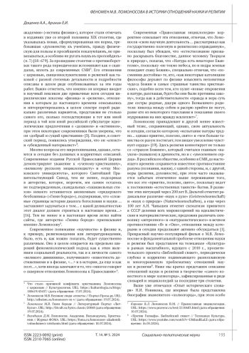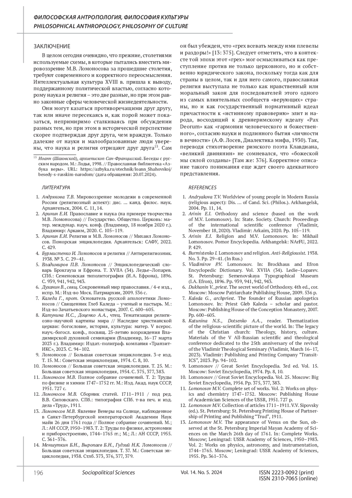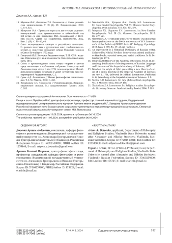 3. Аринин Е.И. Религия и М.В. Ломоносов // Михаил Ломоносов. Поморская энциклопедия. Архангельск: САФУ, 2022. С. 429.