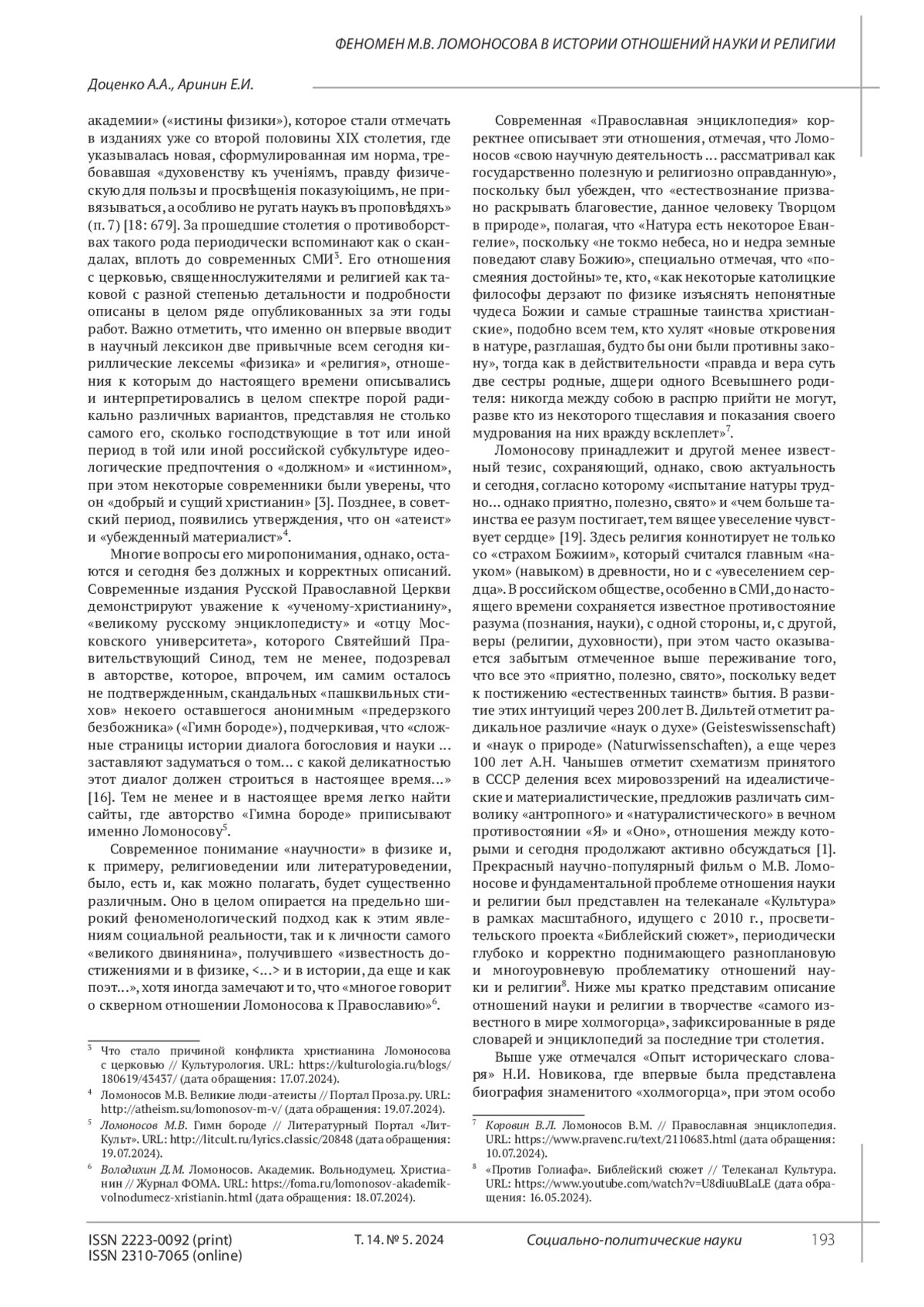 2. Аринин Е.И. Православие и наука (на примере творчества М.В. Ломоносова) // Государство. Общество. Церковь: матер. междунар. науч. конф. (Владимир, 18 ноября 2020 г.). Владимир: Аркаим, 2020. С. 105-119. EDN: YQOFRC