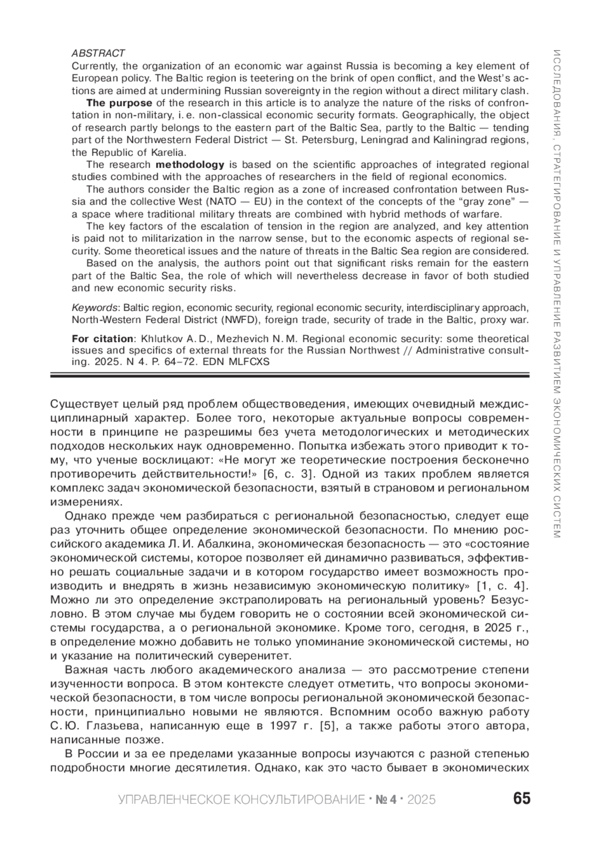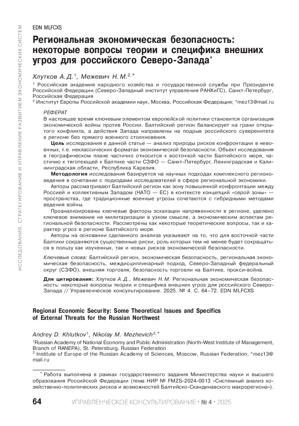 ХЛУТКОВ А. Д., МЕЖЕВИЧ Н. М. РЕГИОНАЛЬНАЯ ЭКОНОМИЧЕСКАЯ БЕЗОПАСНОСТЬ: НЕКОТОРЫЕ ВОПРОСЫ ТЕОРИИ И СПЕЦИФИКА ВНЕШНИХ УГРОЗ ДЛЯ РОССИЙСКОГО СЕВЕРО-ЗАПАДА // УПРАВЛЕНЧЕСКОЕ КОНСУЛЬТИРОВАНИЕ. 2025. № 4 (190)