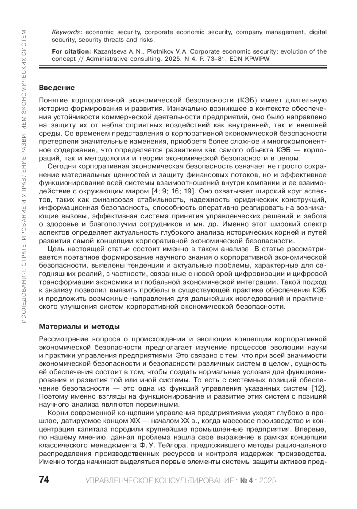 Устойчивость социально-экономической системы во многом определяется уровнем обеспечения экономической безопасности на ее микроуровне. В этой связи высокую значимость имеет обеспечение корпоративной экономической безопасности. В статье анализируются этапы формирования и развития понятия корпоративной экономической безопасности, формирование современной ее парадигмы, а также ее трансформация в условиях новых вызовов. Особое внимание уделено ключевым факторам, определяющим динамику перемен в понимании корпоративной экономической безопасности, таким как глобализация рынков, возникновение новых типов угроз и увеличение значения информационного ресурса. Проведен критический разбор существующих теоретических подходов, выявлены недостатки классических моделей и обозначены перспективы дальнейших исследований. Сделан вывод о необходимости дальнейшей детализации механизмов обеспечения экономической безопасности предприятия в условиях меняющейся геополитической обстановки и растущего уровня неопределенности. Отдельно рассматривается специфика российской ситуации, отмечающая особое значение регуляторной составляющей и потребности разработки унифицированной модели корпоративной экономической безопасности, соответствующей особенностям отечественного бизнеса.