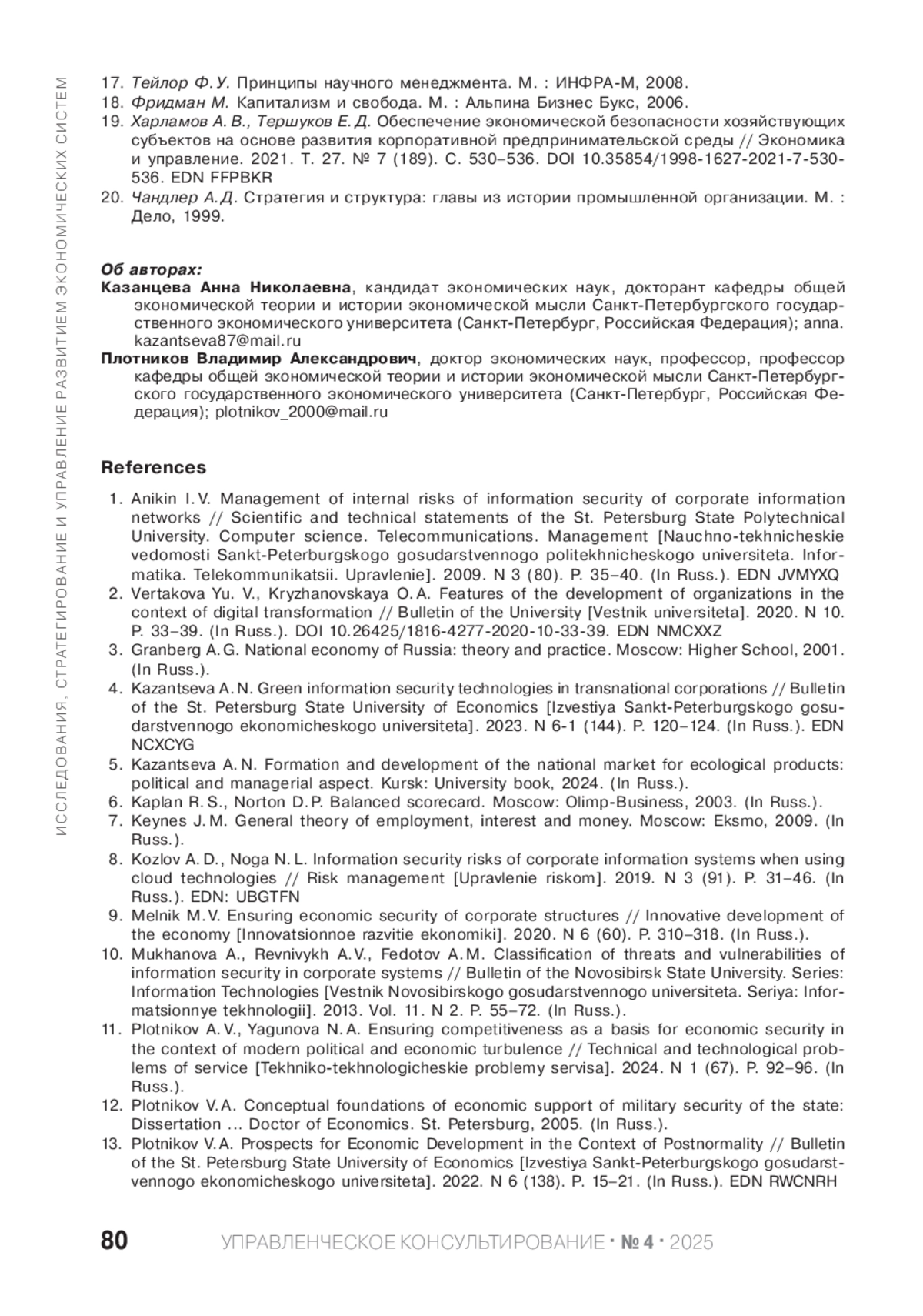 19. Харламов А.В., Тершуков Е. Д. Обеспечение экономической безопасности хозяйствующих субъектов на основе развития корпоративной предпринимательской среды // Экономика и управление. 2021. Т. 27. № 7 (189). С. 530-536. https://doi.org/10.35854/1998-1627-2021-7-530-536. EDN FFPBKR