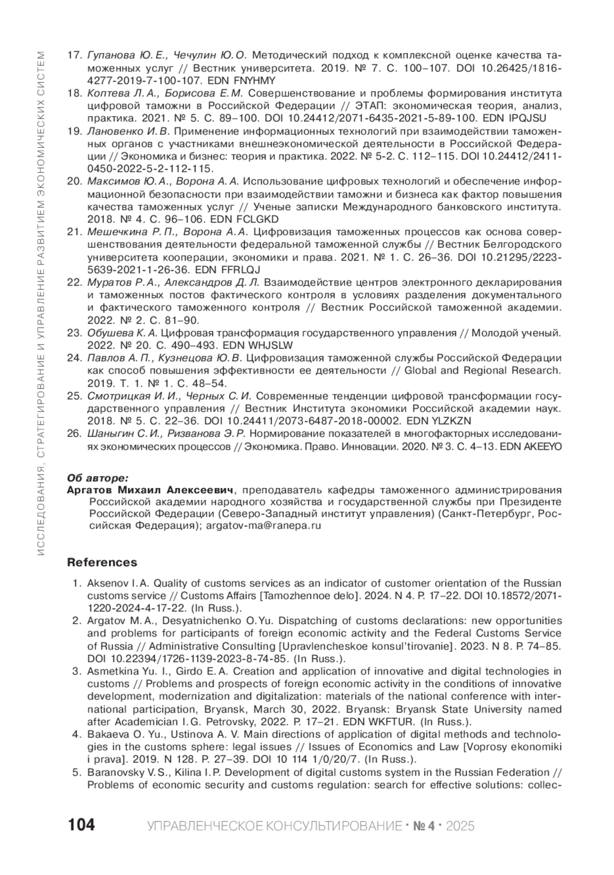 2. Аргатов М. А., Десятниченко О.Ю. Диспетчеризация таможенных деклараций: новые возможности и проблемы для участников ВЭД и ФТС России // Управленческое консультирование. 2023. № 8. C. 74-85. https://doi.org/10.22394/1726-1139-2023-8-74-85.