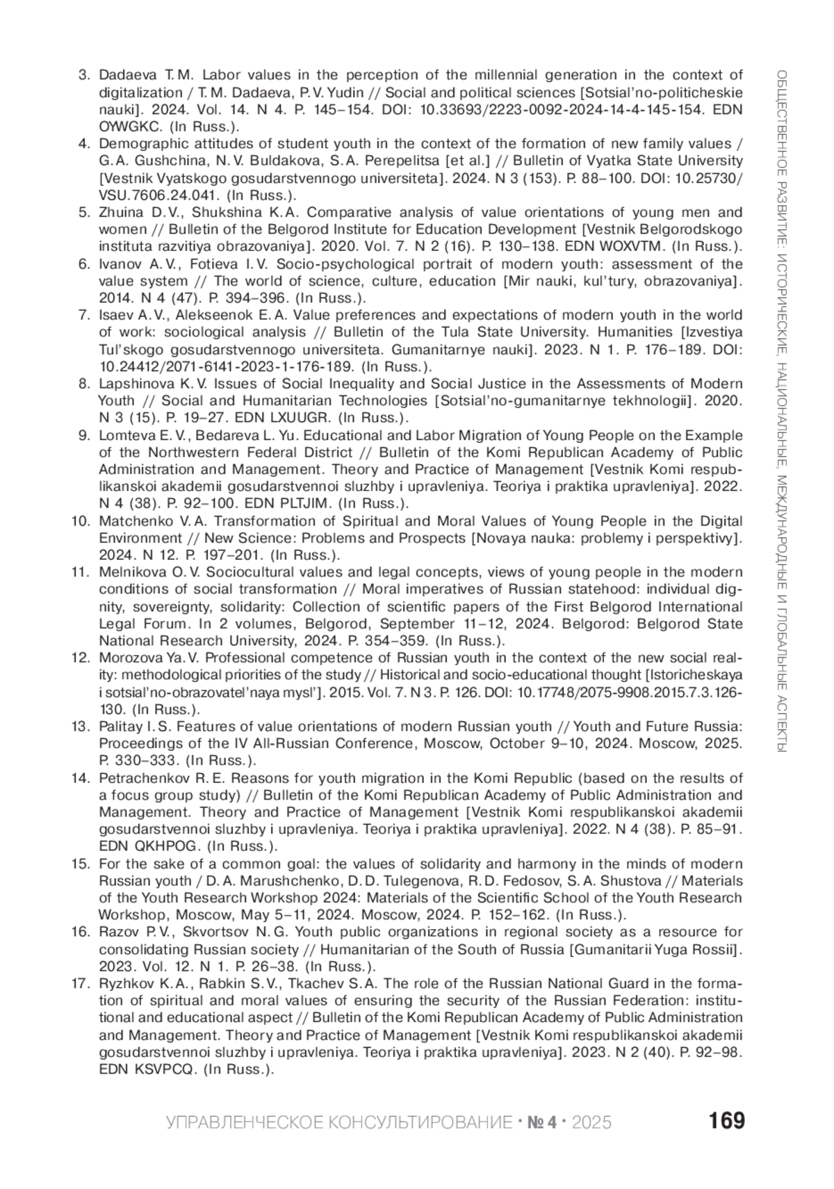3. Дадаева Т. М. Трудовые ценности в восприятии поколения миллениалов в условиях цифровизации / Т. М. Дадаева, П.В. Юдин // Социально-политические науки. 2024. Т. 14, № 4. С. 145-154. https://doi.org/10.33693/2223-0092-2024-14-4-145-154. EDN OYWGKC