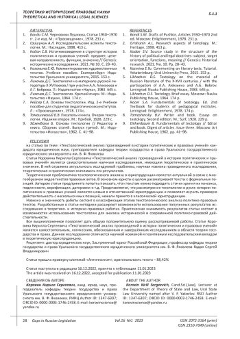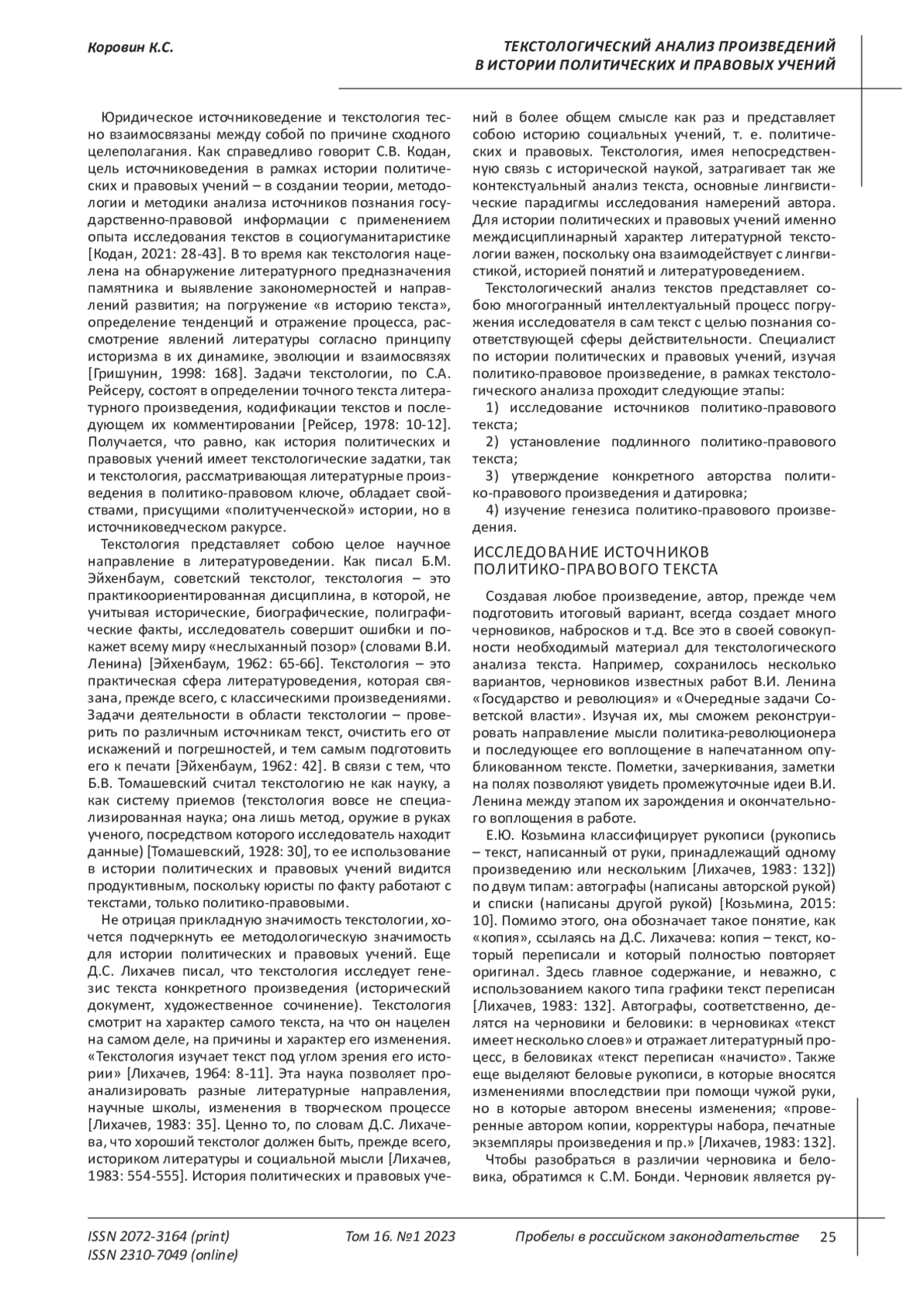 Текстология как литературоведческая область знаний, тем не менее, может и должна использоваться учеными-юристами при анализе политико-правовых текстов. Актуально это особенно для истории политических и правовых учений, для которой текст является ключевым элементом системы. В статье подробно рассматриваются этапы текстологического анализа. (1) Исследование источников политико-правового текста (рукописи делятся на автографы (написаны авторской рукой) и списки (написаны другой рукой); автографы бывают либо черновики, либо беловики). (2) Установление подлинного политико-правового текста (процедура происходит в несколько этапов: реконструкция истории создания текста, поиск его основных источников; расположение всех вариантов произведения в хронологическом порядке с соответствующей мотивировкой его принятия; нахождение различных вариантов и редакций). (3) Утверждение конкретного авторства политико-правового произведения и датировка (существует несколько способов атрибуции: исследование различных документов, социологический и лингвостилистический анализ; способы определения датировки: палеографические (анализ бумаги и почерка автора), определение датировки по «датирующим признакам»). (4) Изучение генезиса политико-правового произведения (содержанием выявления истоков зарождения текста у автора будет реконструкция различных событий, связанных с произведением).