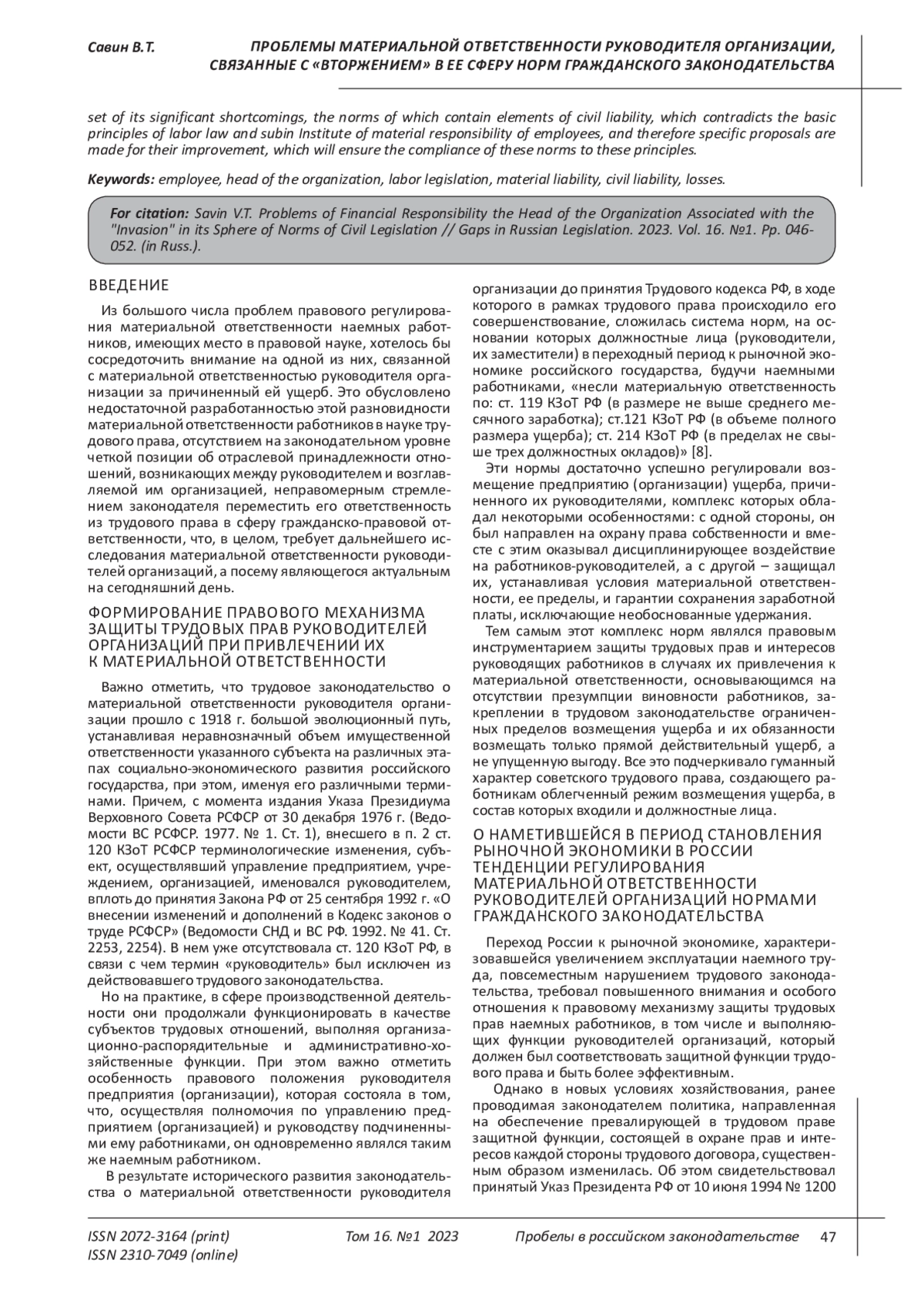 Savin V. T. Formation and development of labor legislation regulating the financial responsibility of the head of the organization // Gaps in Russian legislation. 2022. No. 5. p. 239. EDN: IGIISR
