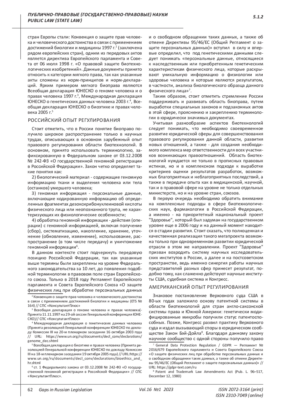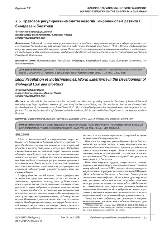 В данной статье автор рассматривает наиболее актуальные вопросы в сфере правового регулирования биомедицины и биотехнологий в ряде стран Европейского Союза, США и России. Поднимаются вопросы развития молодой отрасли права “биоэтика”, рассматриваются уникальные модели и выдвигаются предложения для имплементации наиболее подходящих мировых моделей в медико-юридическую сферу в Российской Федерации.