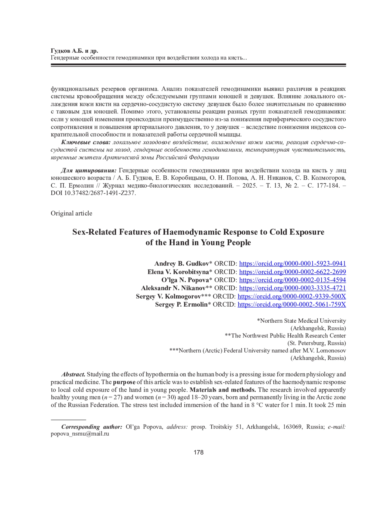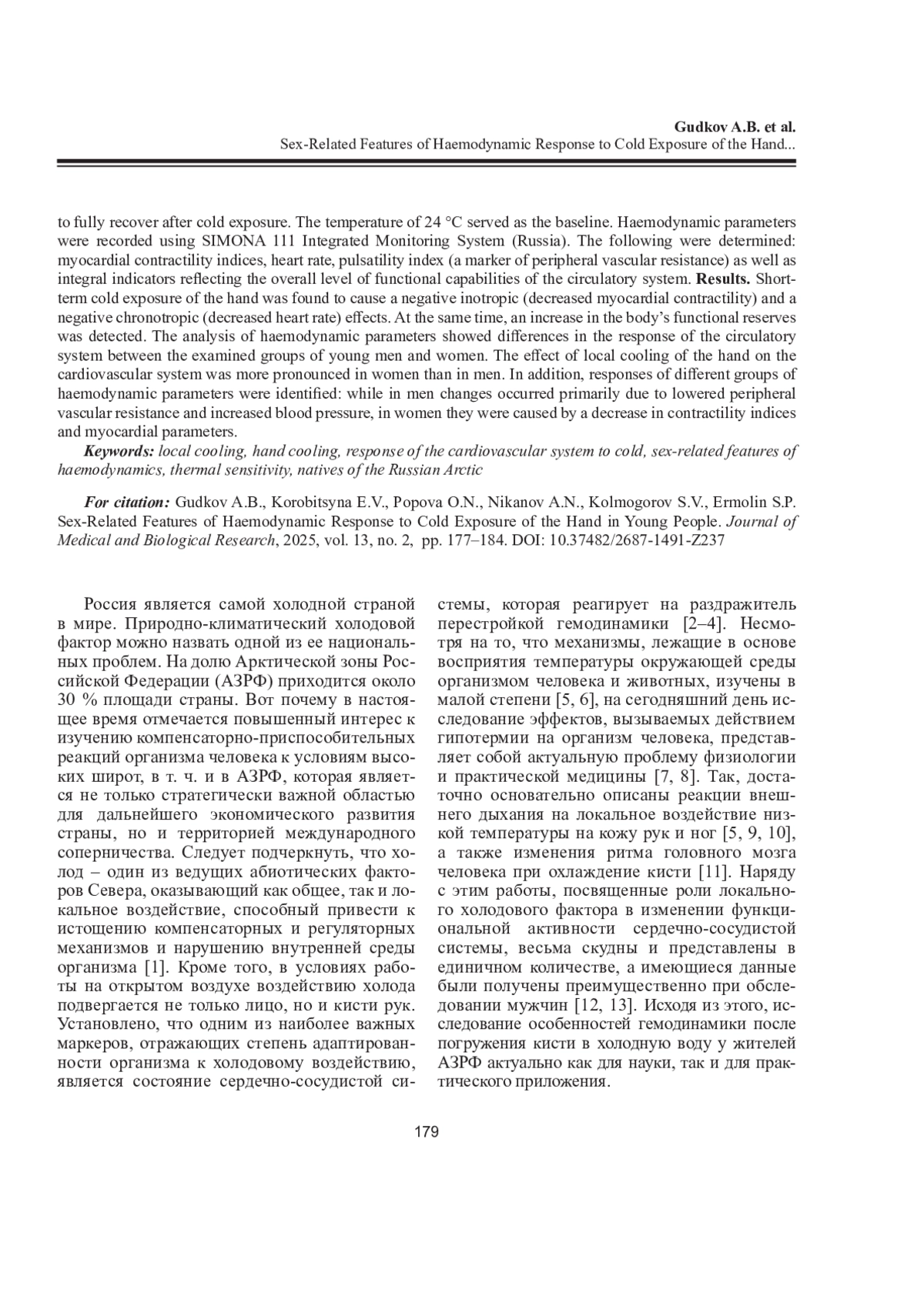 Материалы и методы. В исследовании приняли участие практически здоровые юноши (n = 27) и девушки (n = 30) в возрасте 18-20 лет, родившиеся и постоянно проживающие на территории Арктической зоны Российской Федерации. Холодовая нагрузка моделировалась путем водной иммерсии кисти при температуре 8 °C в течение 1 мин. Для полного восстановления после воздействия холода требовалось 25 мин. В качестве фоновой нагрузки была выбрана температура 24 °С. Показатели гемодинамики регистрировались при помощи аппаратно-программного комплекса «Система интегрального мониторинга “СИМОНА 111”» (Россия). Определялись индексы сократимости сердечной мышцы, частота сердечных сокращений, пульсовой индекс периферического сосудистого сопротивления и интегральные показатели, отражающие общий уровень функциональных возможностей системы кровообращения.
