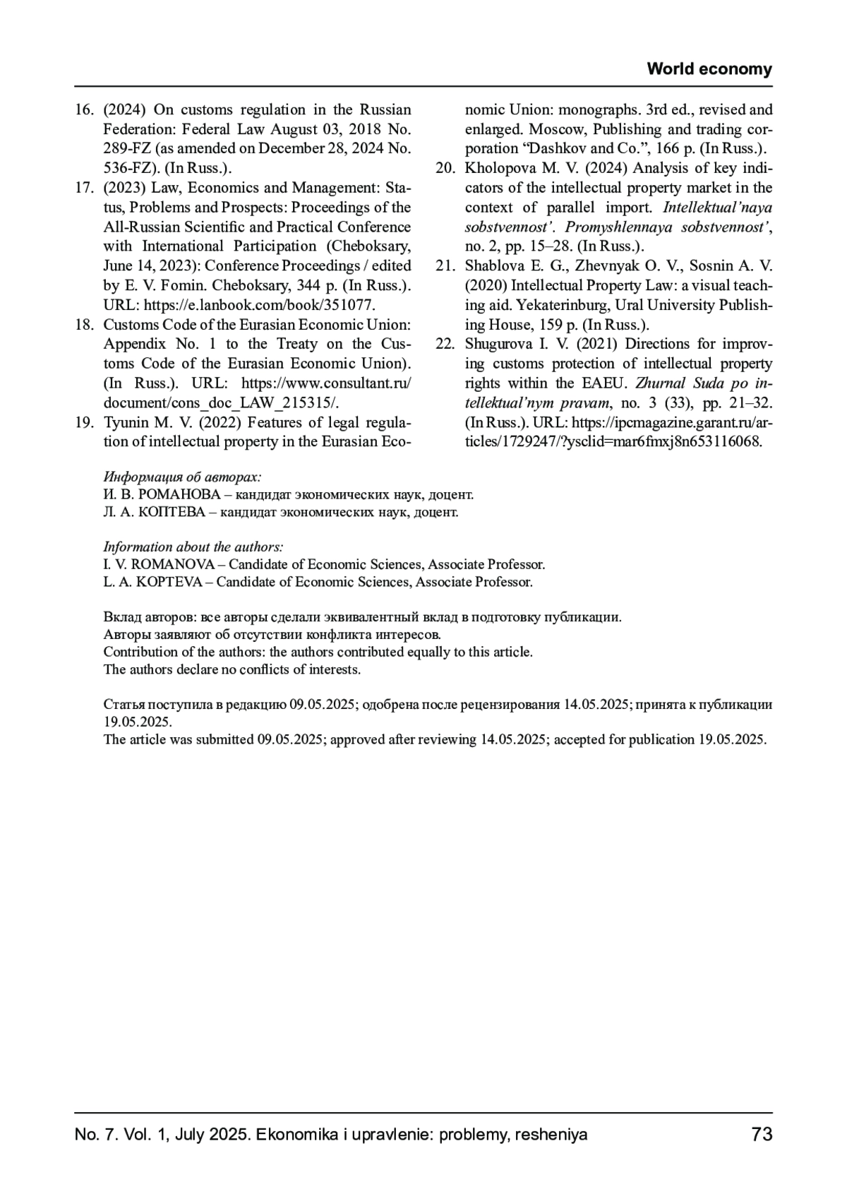 20. Холопова М. В. Анализ ключевых показателей рынка интеллектуальной собственности в условиях параллельного импорта // Интеллектуальная собственность. Промышленная собственность. 2024. № 2. С. 15-28.