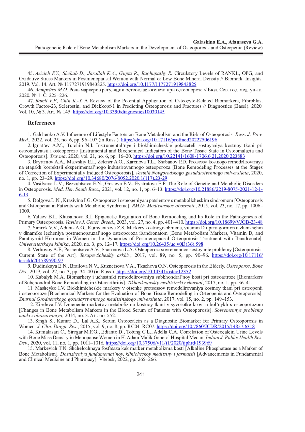 46. Астрейко М.О. Роль маркеров регуляции остеокластогенеза при остеопорозе // Бюл. Сев. гос. мед. ун-та. 2020. No 1. С. 225-226. EDN: JIAJTJ