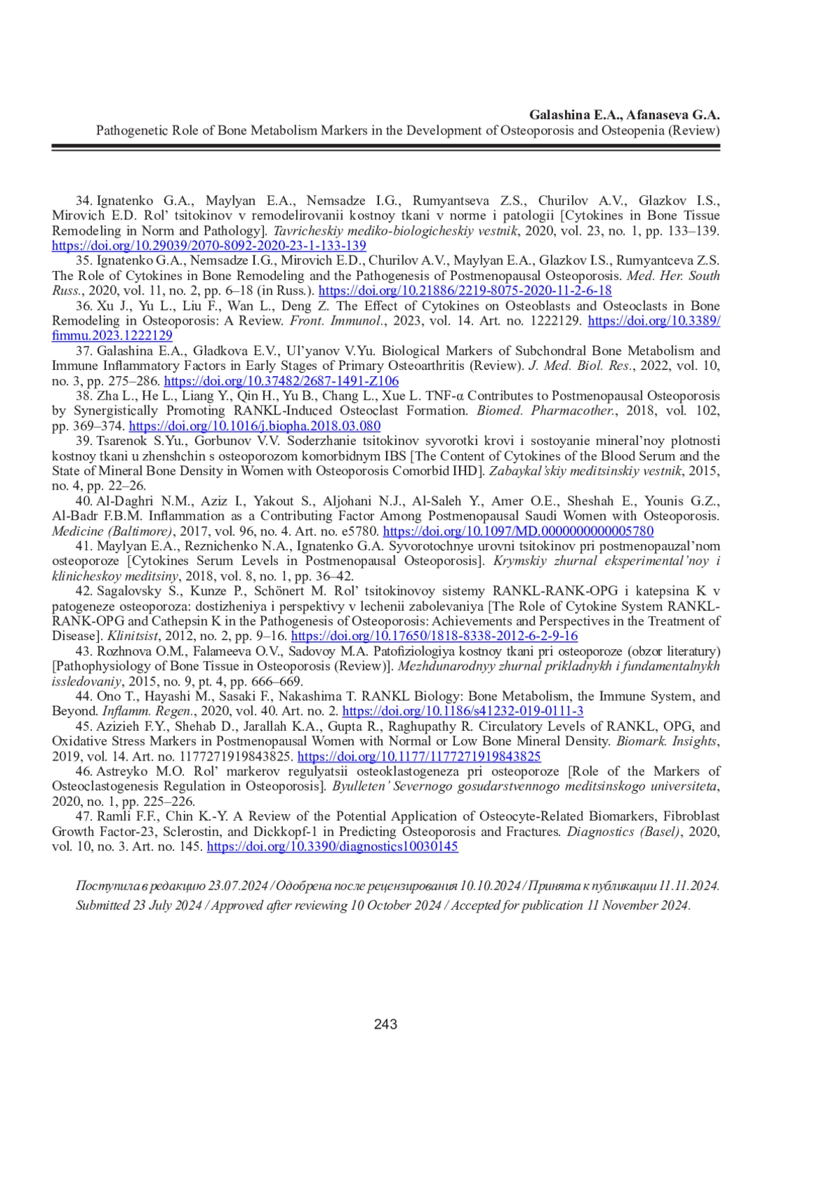 35. Игнатенко Г.А., Немсадзе И.Г., Мирович Е.Д., Чурилов А.В., Майлян Э.А., Глазков А.Э., Румянцева З.С. Роль цитокинов в ремоделировании костной ткани и патогенезе постменопаузального остеопороза // Мед. вестн. Юга России. 2020. Т. 11, No 2. С. 6-18. DOI: 10.21886/2219-8075-2020-11-2-6-18 EDN: JLMNIV