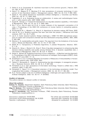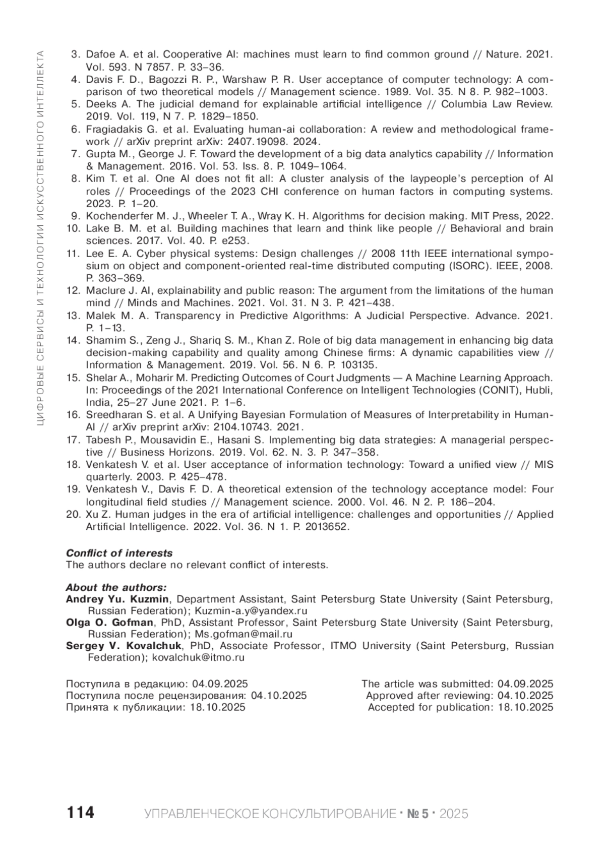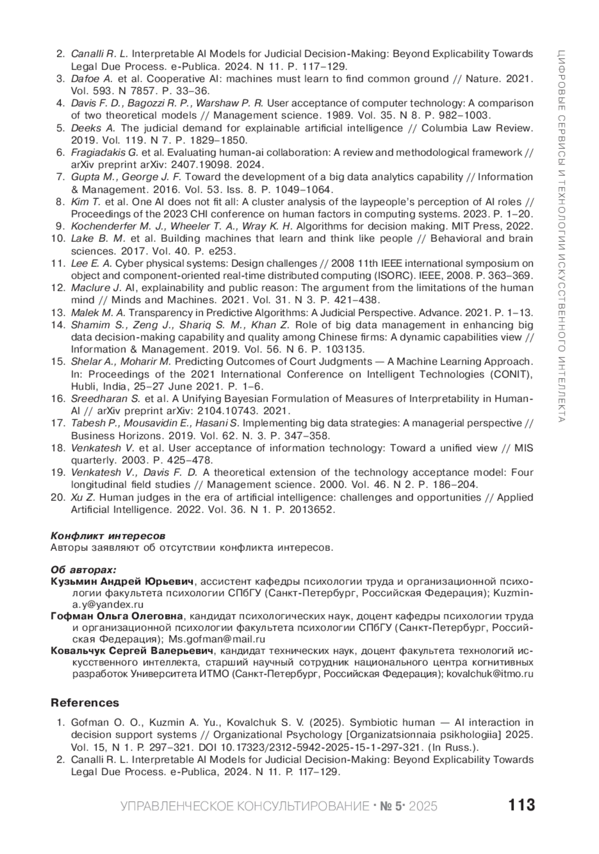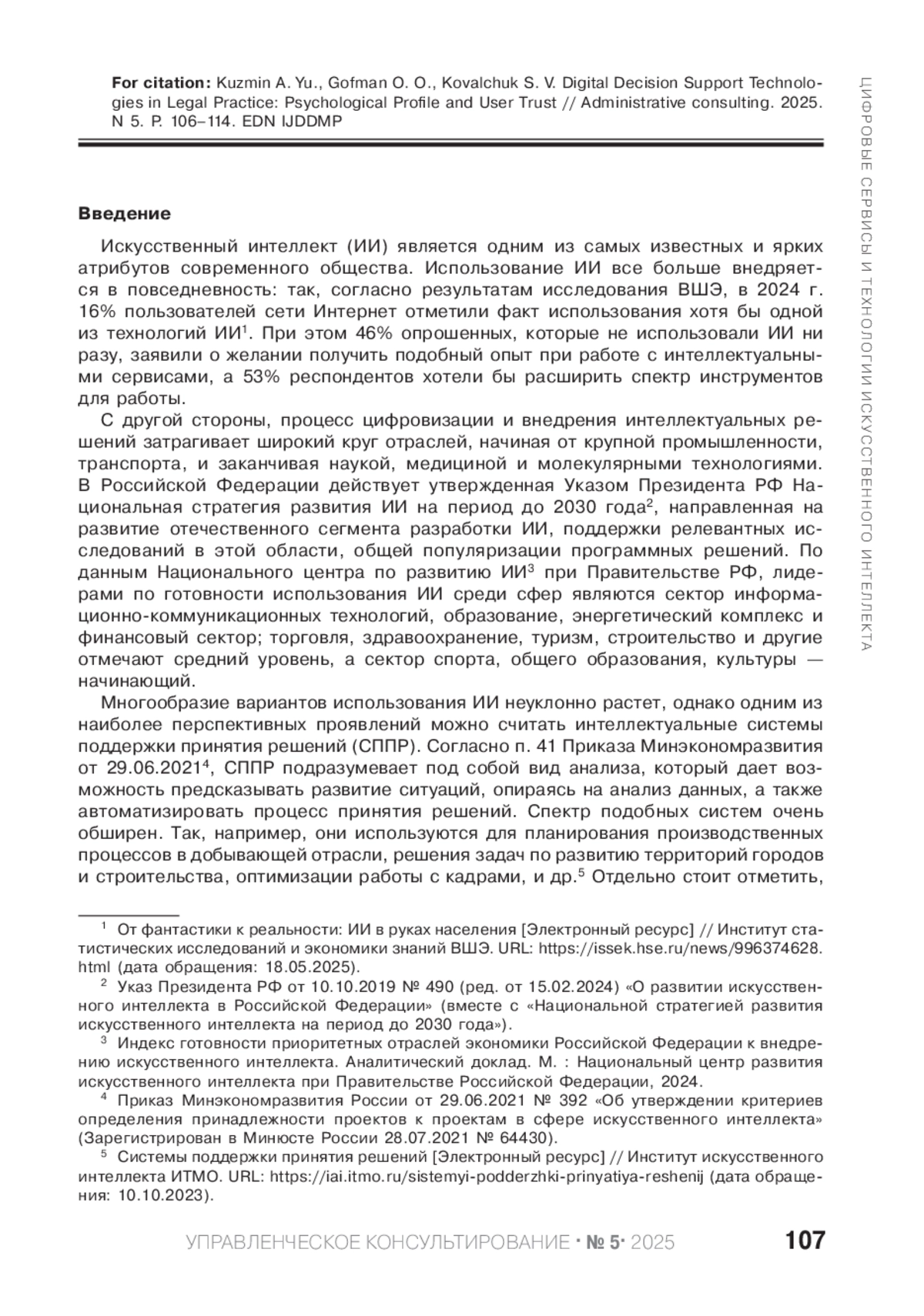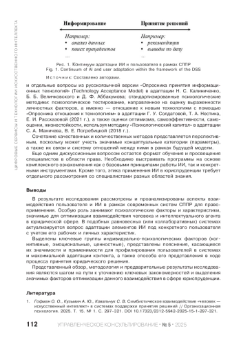 КУЗЬМИН А. Ю., ГОФМАН О. О., КОВАЛЬЧУК С. В. ЦИФРОВЫЕ ТЕХНОЛОГИИ ПОДДЕРЖКИ ПРИНЯТИЯ РЕШЕНИЙ В ЮРИСПРУДЕНЦИИ: ПСИХОЛОГИЧЕСКИЙ ПРОФИЛЬ И ДОВЕРИЕ ПОЛЬЗОВАТЕЛЕЙ // УПРАВЛЕНЧЕСКОЕ КОНСУЛЬТИРОВАНИЕ. 2025. № 5 (191)