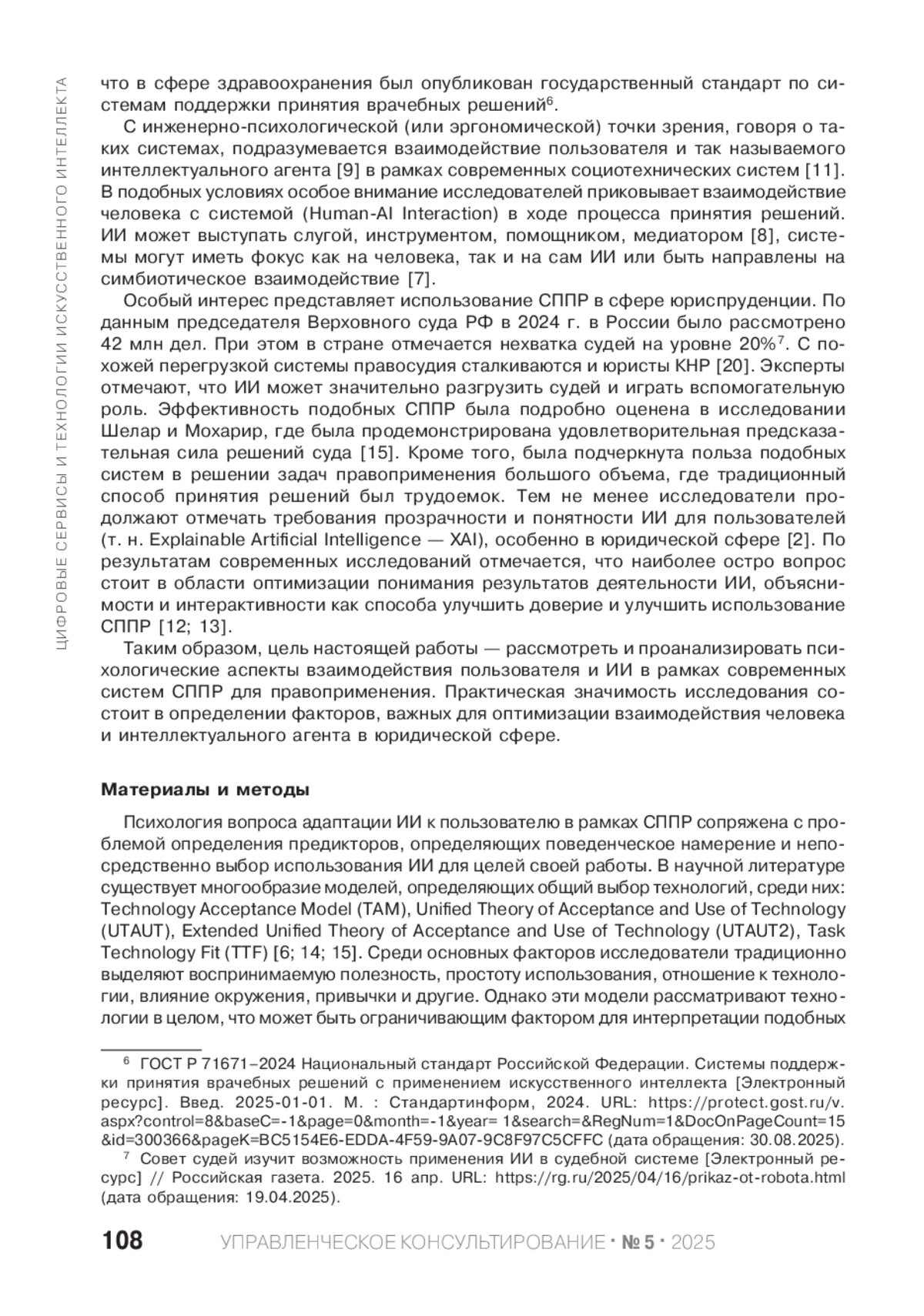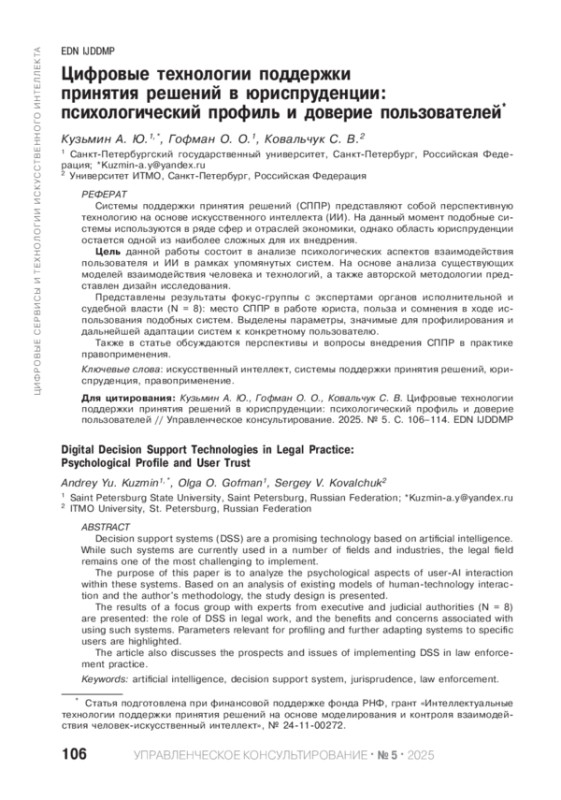 Статья: Цифровые технологии поддержки принятия решений в юриспруденции: психологический профиль и доверие пользователей (2025)