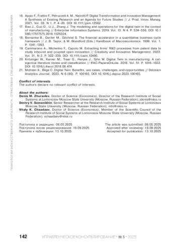 21. Mohsen A., Bilge C. Digital Twin: Benefits, use cases, challenges, and opportunities // Decision Analytics Journal. 2023. N 6 (80). P. 100165. https://doi.org/10.1016/j.dajour.2023.100165.