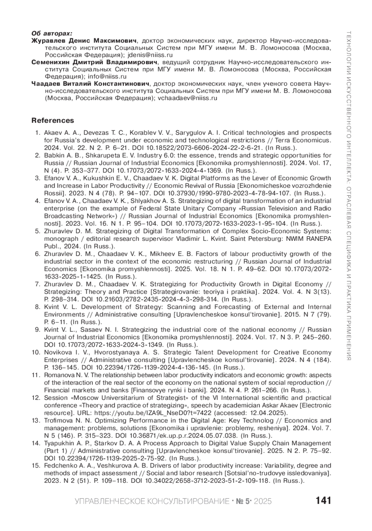 7. Журавлев Д. М., Чаадаев В. К. Стратегирование роста производительности труда в цифровой экономике // Стратегирование: теория и практика. 2024. Т. 4. № 3 (13). С. 298-314. https://doi.org/10.21603/2782-2435-2024-4-3-298-314.
