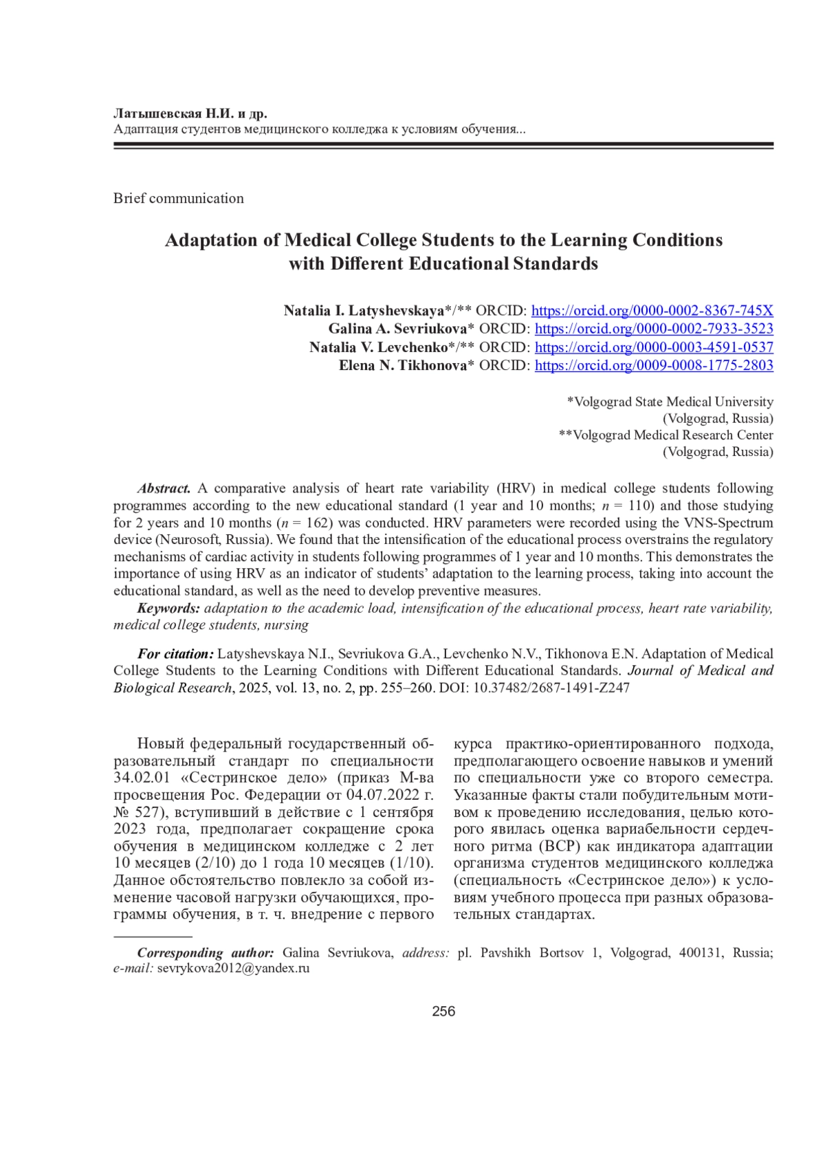 Проведен сравнительный анализ вариабельности сердечного ритма студентов медицинского колледжа, обучающихся по новому образовательному стандарту (1 год 10 месяцев; n = 110) и обучающихся 2 года 10 месяцев (n = 162). С использованием прибора «ВНС-Спектр» («Нейрософт», Россия) регистрировались параметры вариабельности сердечного ритма. В результате проведенного исследования установлено перенапряжение регуляторных механизмов сердечной деятельности у студентов, обучающихся 1 год 10 месяцев, вследствие интенсификации учебного процесса. Это обосновывает использование вариабельности сердечного ритма как показателя адаптации студентов к условиям обучения при разных образовательных стандартах и необходимость разработки комплекса профилактических мероприятий.
