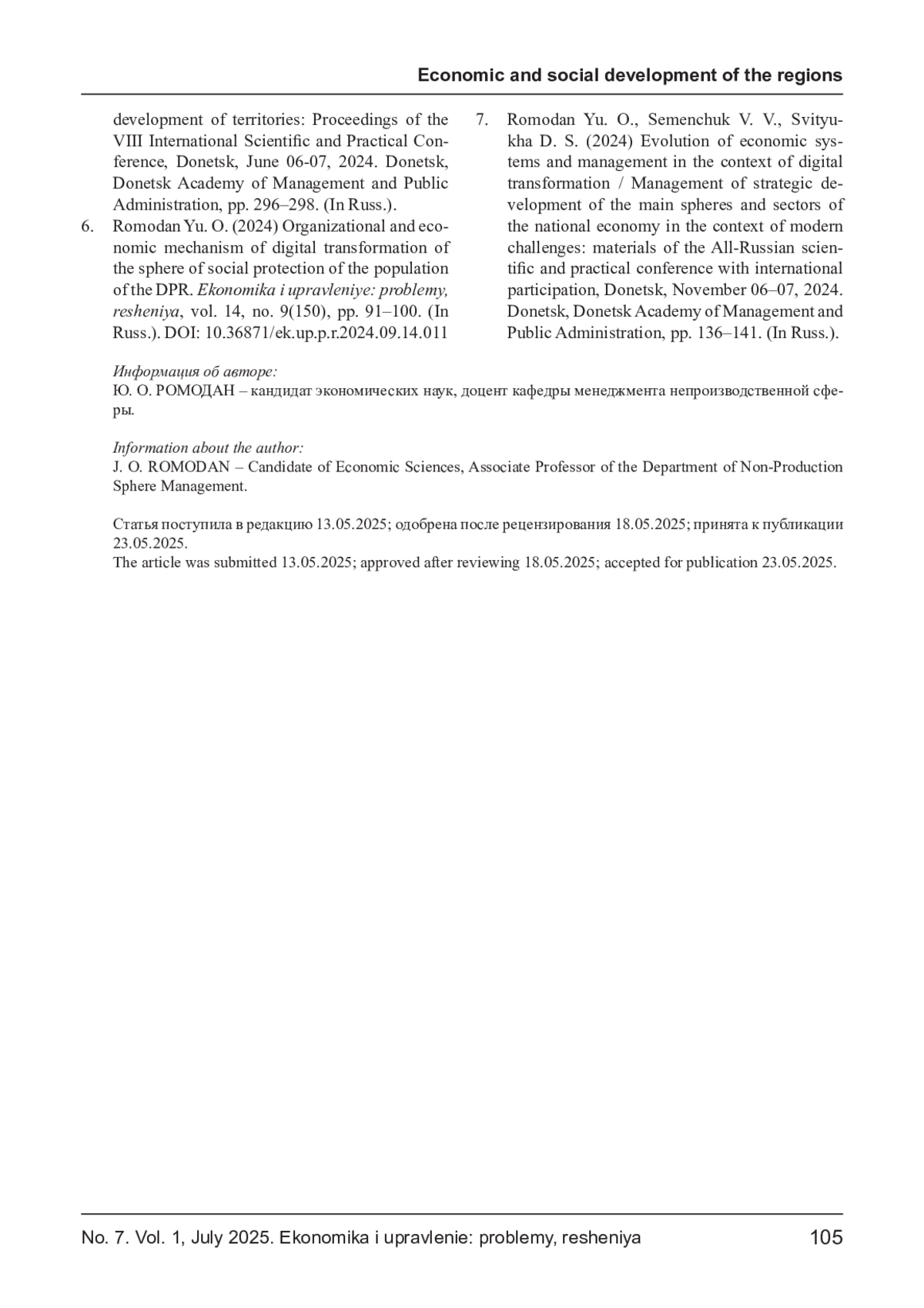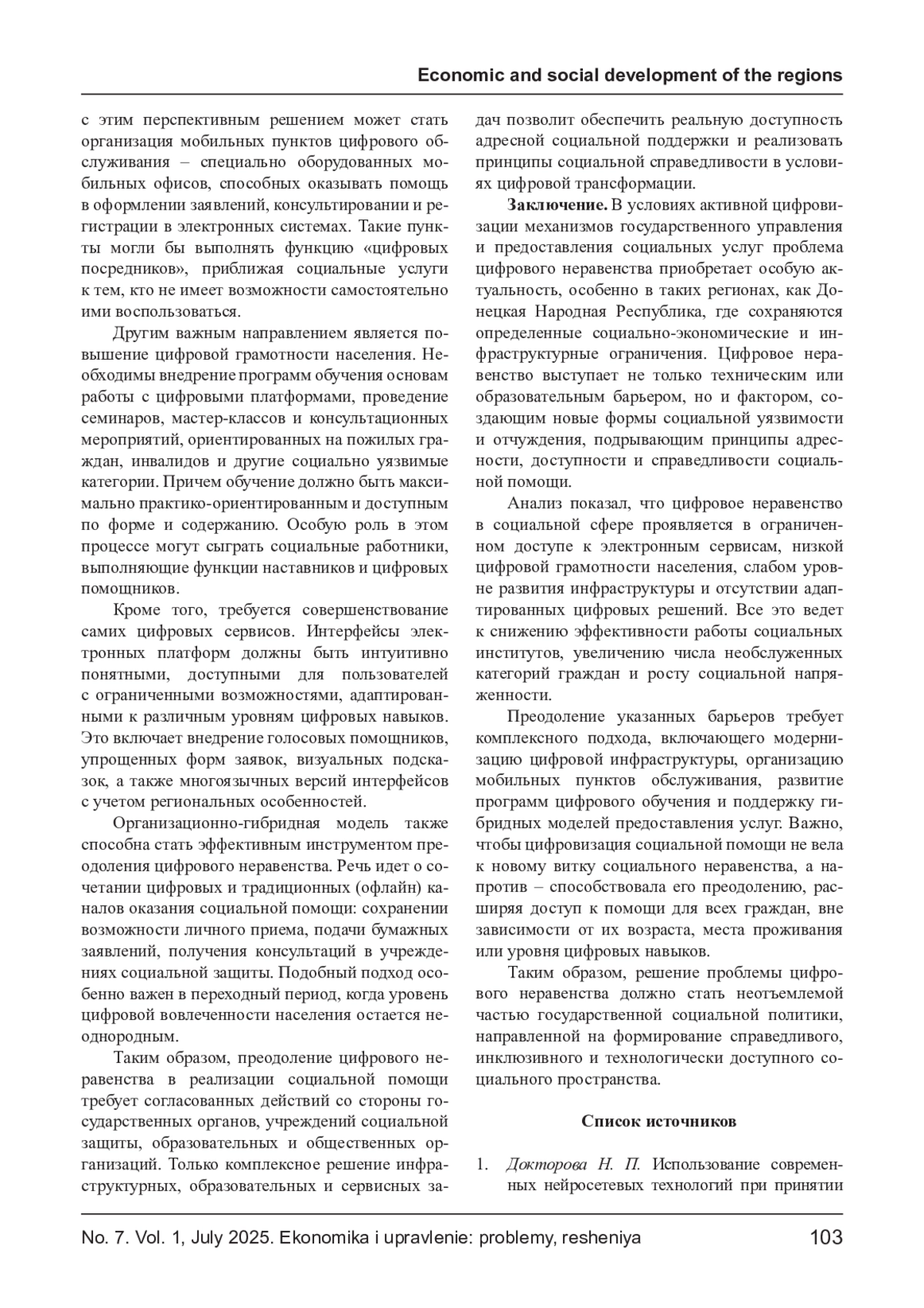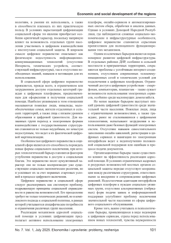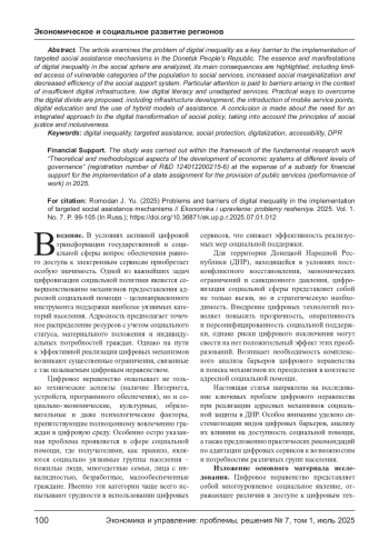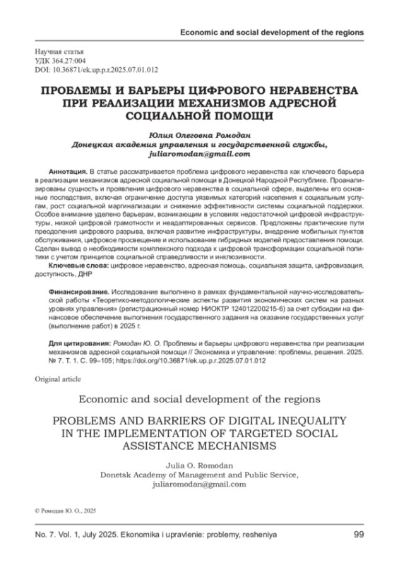 РОМОДАН Ю. О. ПРОБЛЕМЫ И БАРЬЕРЫ ЦИФРОВОГО НЕРАВЕНСТВА ПРИ РЕАЛИЗАЦИИ МЕХАНИЗМОВ АДРЕСНОЙ СОЦИАЛЬНОЙ ПОМОЩИ // ЭКОНОМИКА И УПРАВЛЕНИЕ: ПРОБЛЕМЫ, РЕШЕНИЯ. 2025. ТОМ 1 № 7