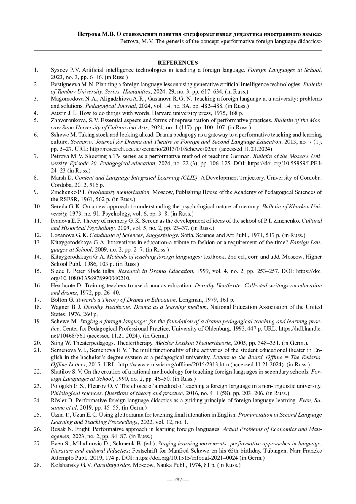 7. Петрова М.В. Съемка сериала как перформативный метод обучения немецкому языку // Вестник Московского университета. Серия 20. Педагогическое образование. 2024. № 22 (3). С. 106-125. https://doi.org/https://doi.org/10.55959/LPEJ-24-23.