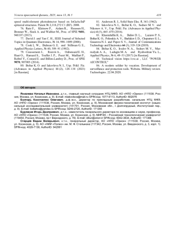 - Khamidullin K. A., Baliev D. L., Lazarev P. S., Boltar K. O., Polesskiy A. V., Burlakov I. D., Chepunov E. L., Gusarova N. I., Popov S. V. / Journal of Communications Technology and Electronics. 2019. Vol. 64. № 3. P. 319–324.
