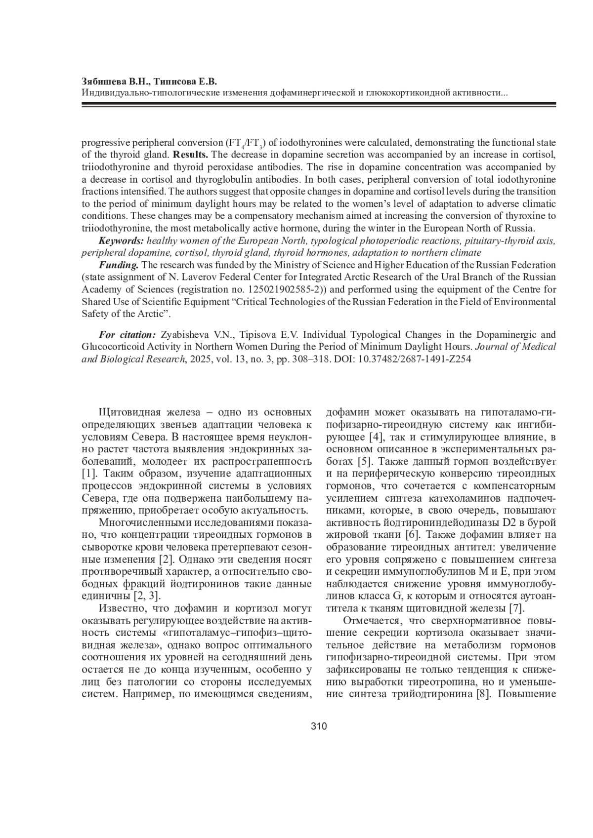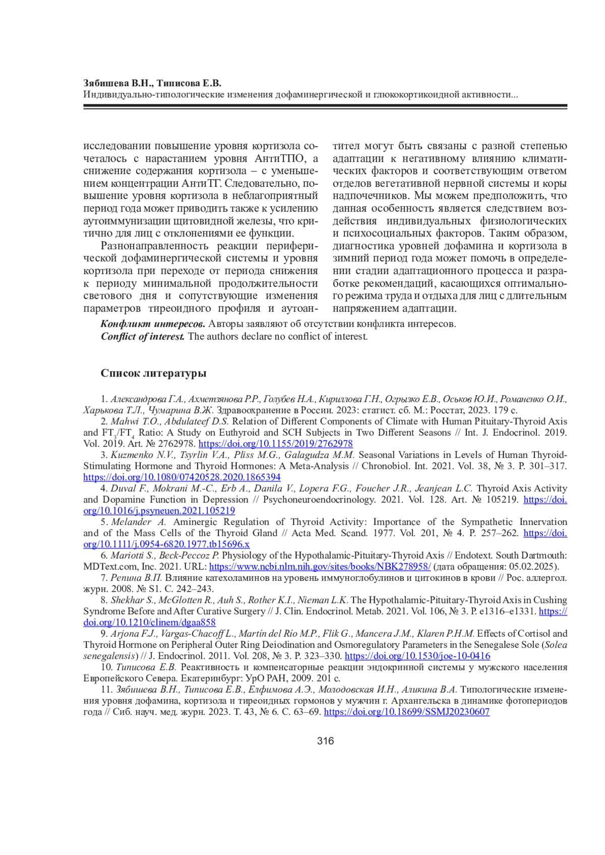 11. Зябишева В.Н., Типисова Е.В., Елфимова А.Э., Молодовская И.Н., Аликина В.А. Типологические изменения уровня дофамина, кортизола и тиреоидных гормонов у мужчин г. Архангельска в динамике фотопериодов года // Сиб. науч. мед. журн. 2023. Т. 43, No 6. С. 63-69. DOI: 10.18699/SSMJ20230607 EDN: HPENZR