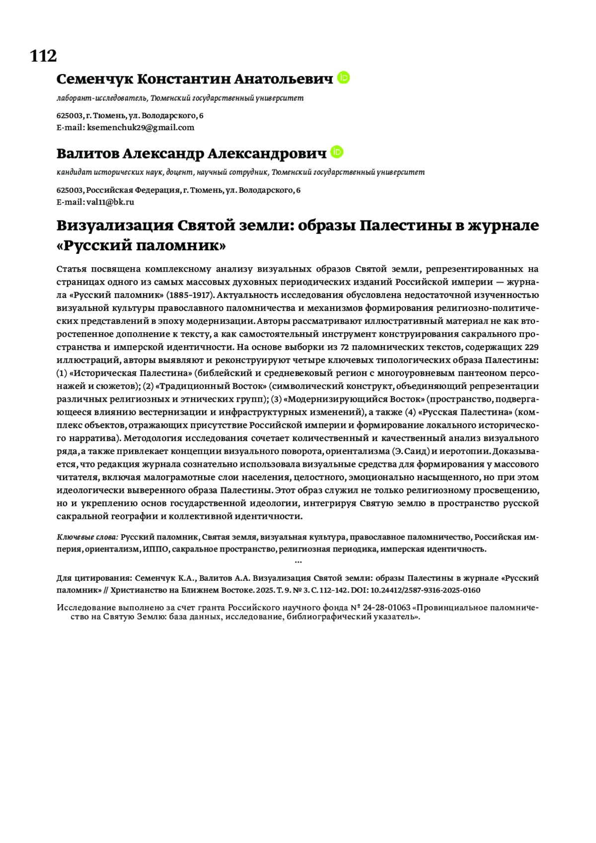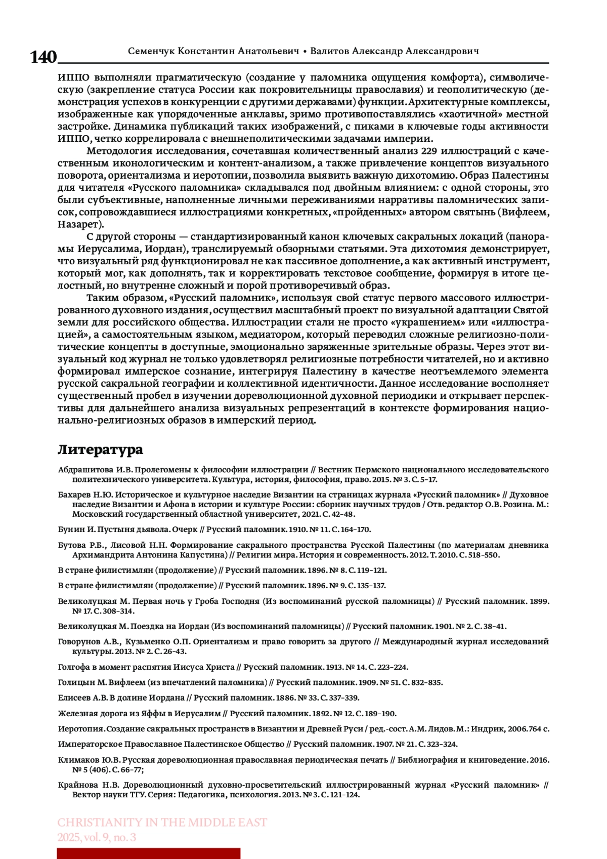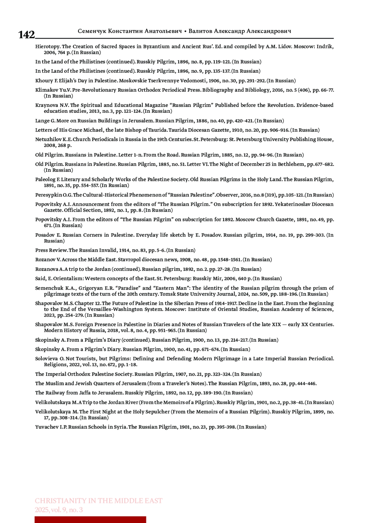 31. Семенчук К.А., Григорян Э.Р. “Райский уголок” и “восточный человек”: идентичность русского пилигрима сквозь призму паломнических текстов рубежа XIX-XX вв. // Вестник Томского государственного университета. 2024. № 509. С. 188-196.